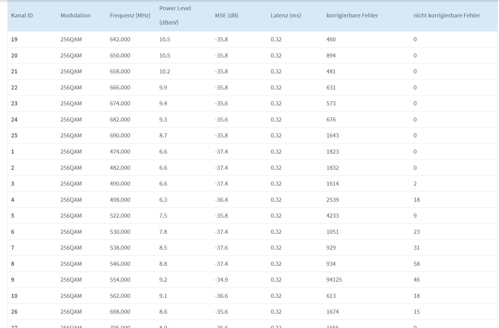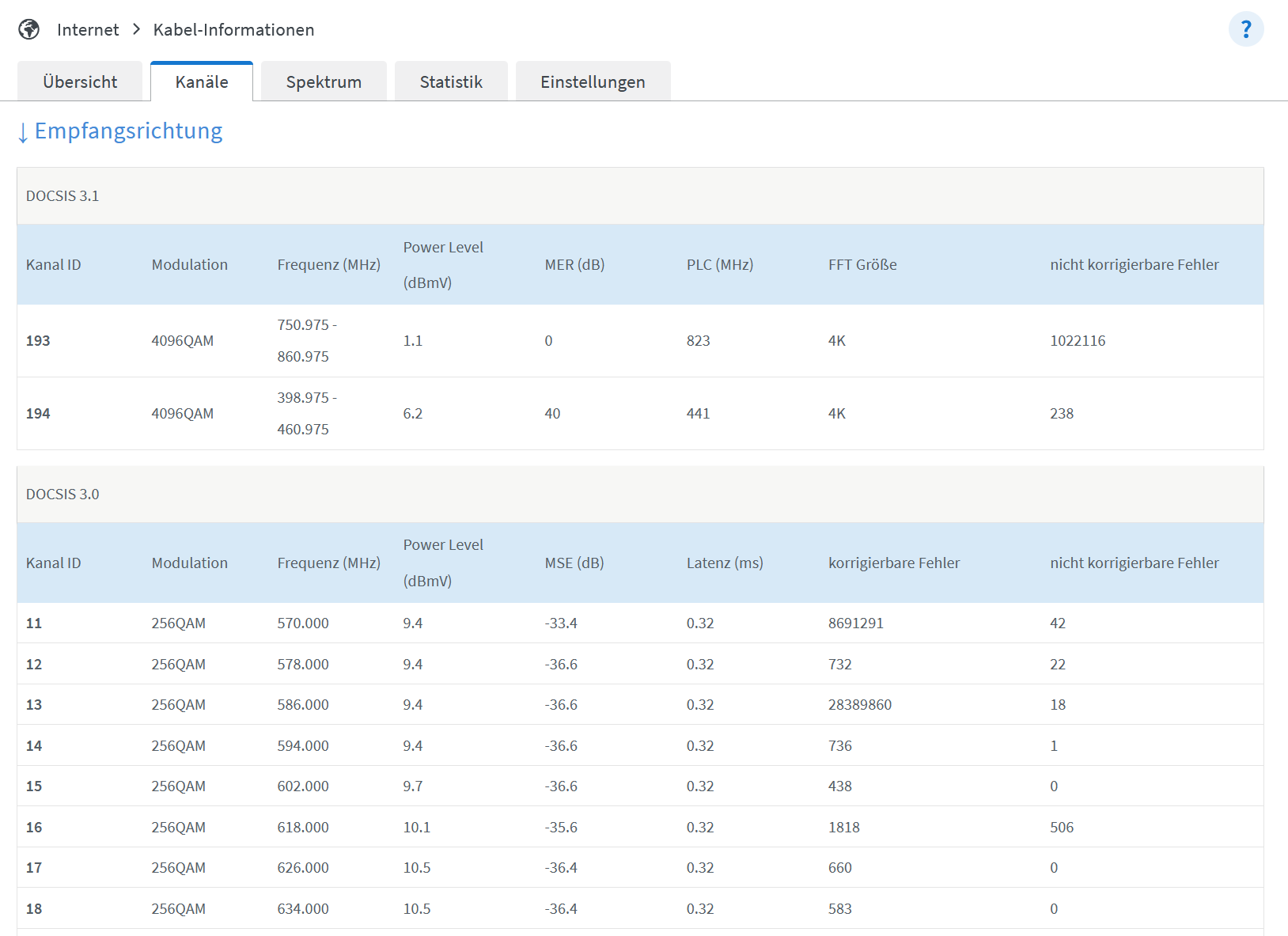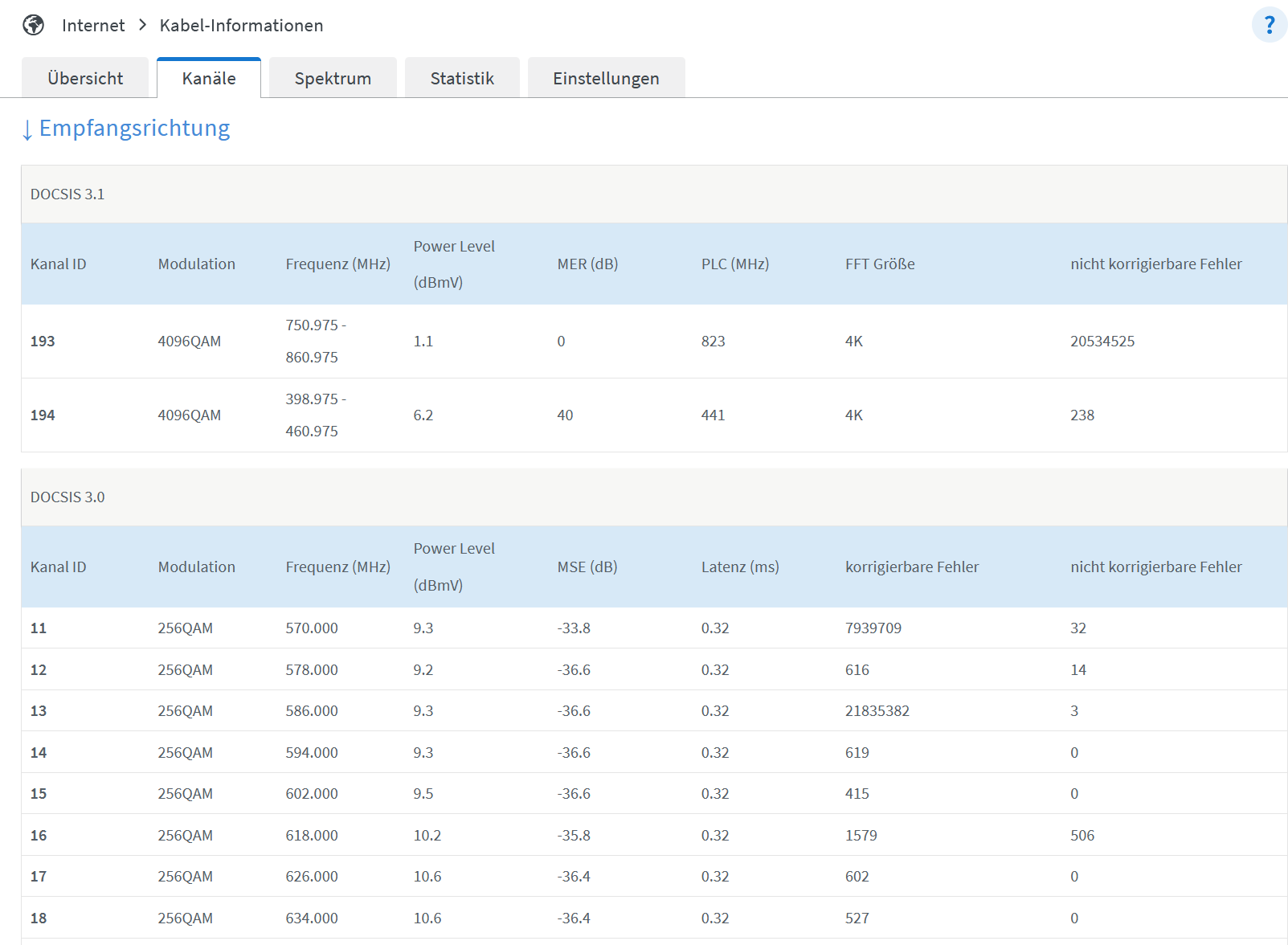 Was mir da besonders auffällt ist der Kanal 193 sowie der Power-Level und der MER Wert da dieser bei 0 ist. Laut einem Techniker durfte dieser Kanal gar nicht auftauchen.