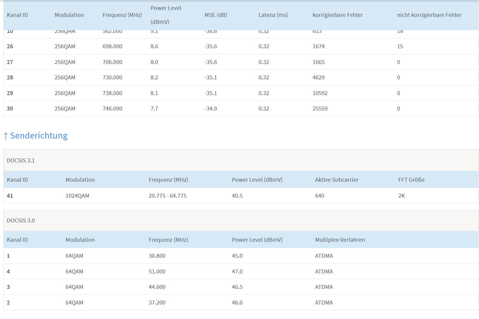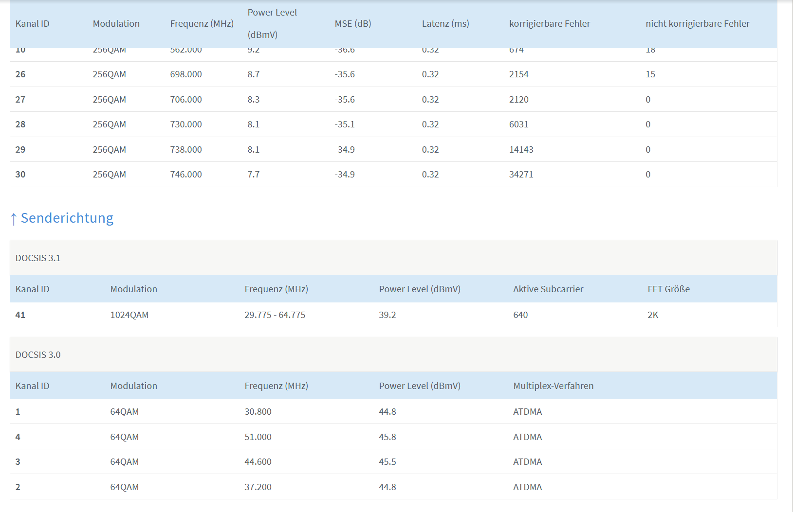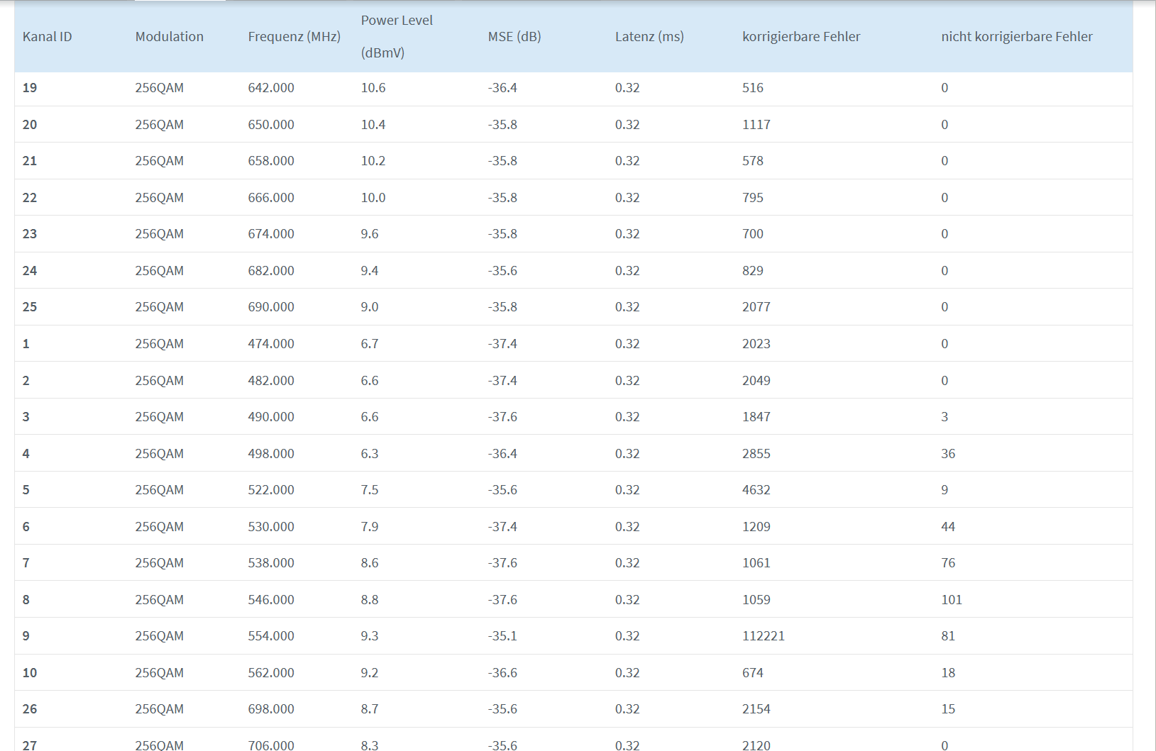 Was mir da besonders auffällt ist der Kanal 193 sowie der Power-Level und der MER Wert da dieser bei 0 ist. Laut einem Techniker durfte dieser Kanal gar nicht auftauchen.