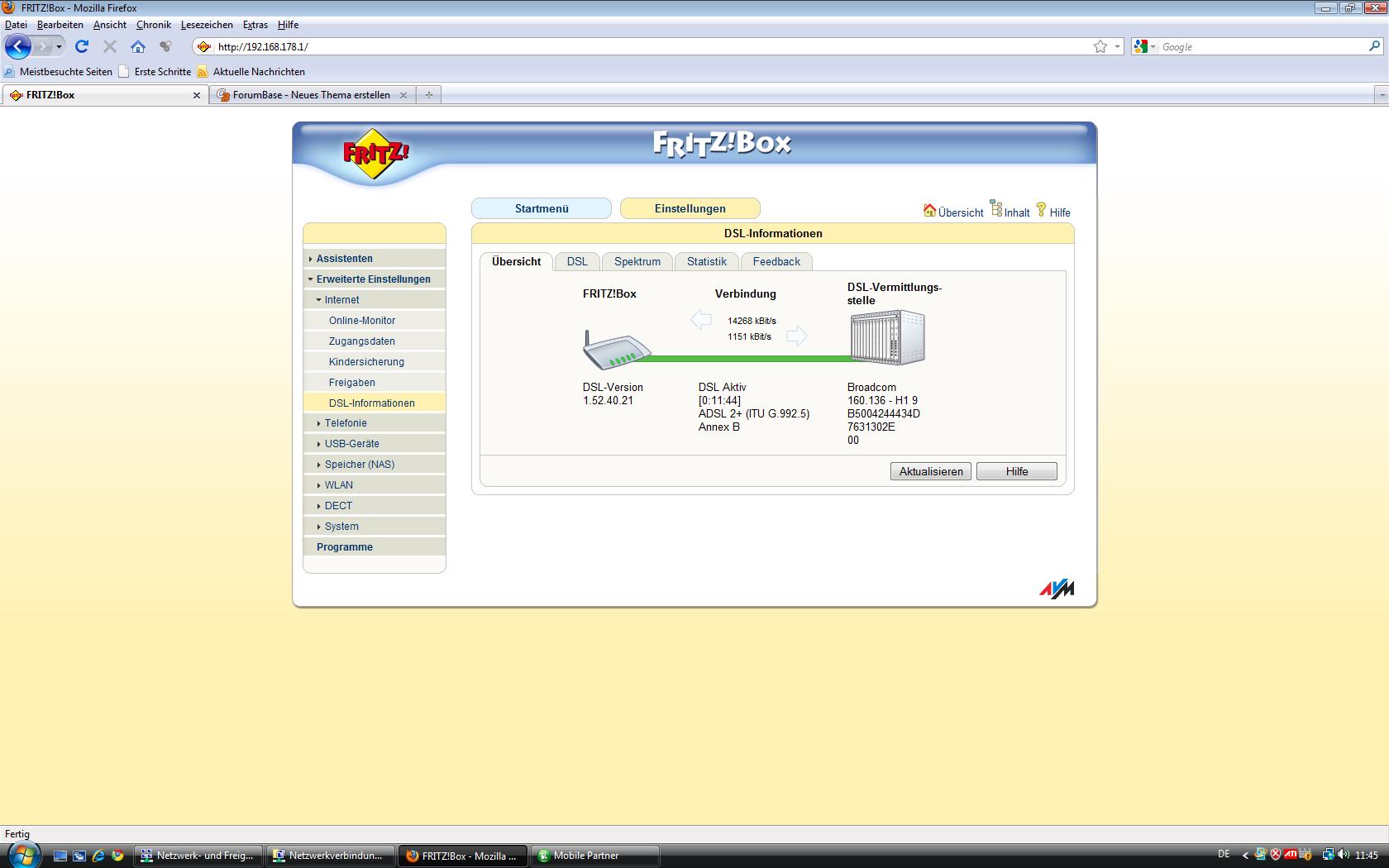 wenn ich im browser http://192.168.178.1/ eingebe, komme ich auf die seite der fritz box, dort kann man sehen, das internet und dsl aktiv und bereit sind