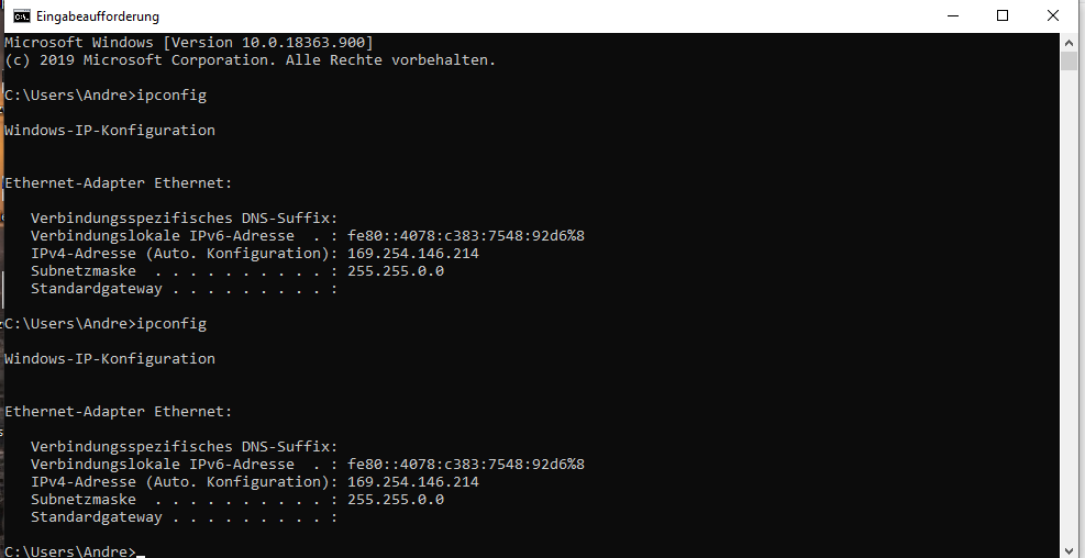 So, nun CMD auf machen und ipconfig eintippen.