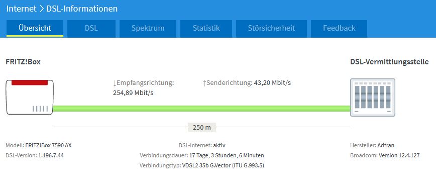 Die Box ist seit Mittwochabend 17.08.2022 an dem Anschluss eingerichtet und hat immer wieder Neuverbindungen bzgl. der DSL Verbindung. Anfangs lief Sie auf max Performance, wo die Abbrüche in kürzeren Abständen auftraten und es beim DSL bei den DSL-Informationen auch seitens der FritzBox mal nen Fehler gab aber die auf Seite der Vermittlungsstelle noch um einiges höher ausfielen.