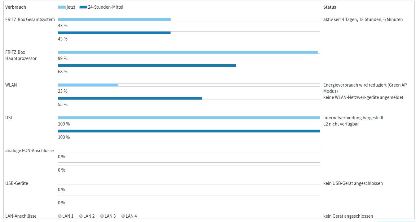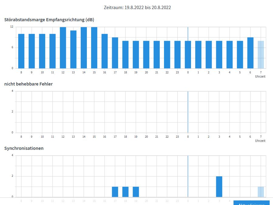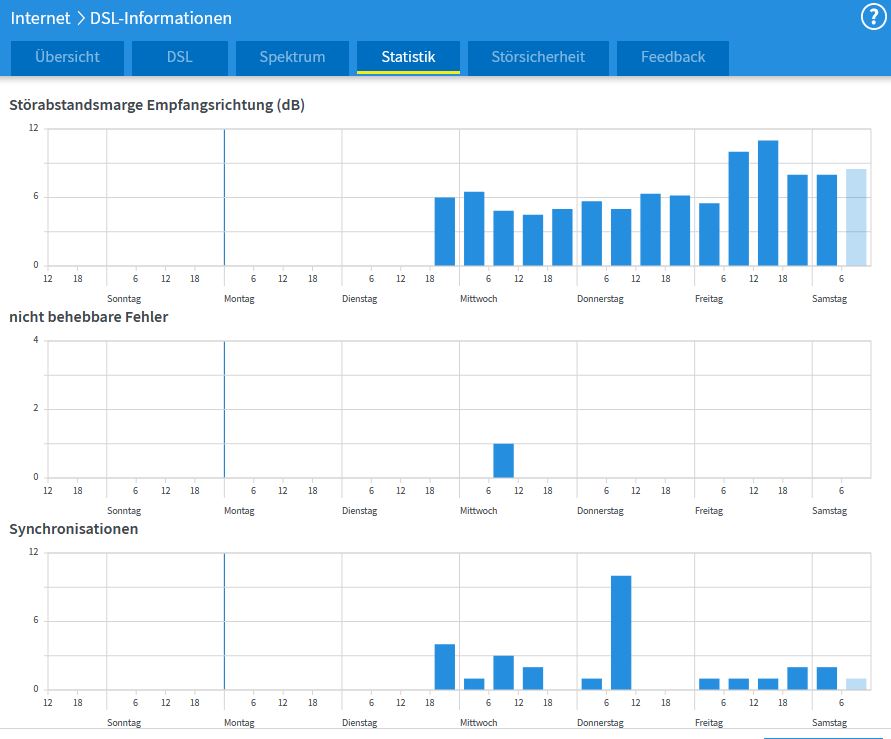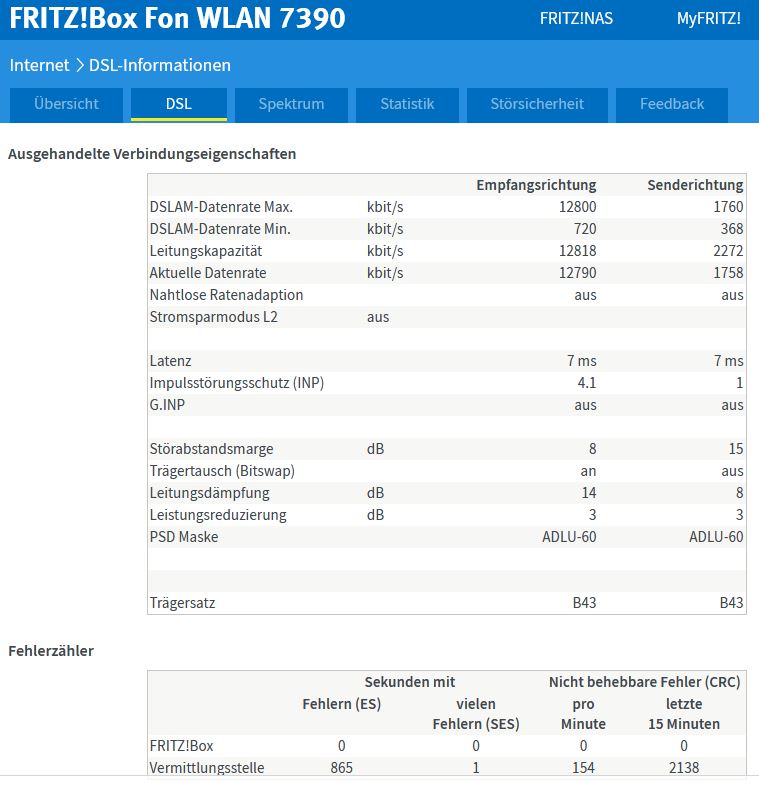 Aktuell steht es in der Performance in der Mitte, Fehler bei der FritzBox 0 , aber weiterhin bei der Vermittlungsstelle und es gibt noch immer Abbrüche bei der DSL-Verbindung.
