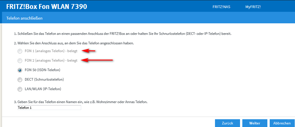 Ich möchte gerne beide Geräte an die FB anschliesen. Externe Dect Basisisstation des Telefons an fon1 und Fax an fon2.