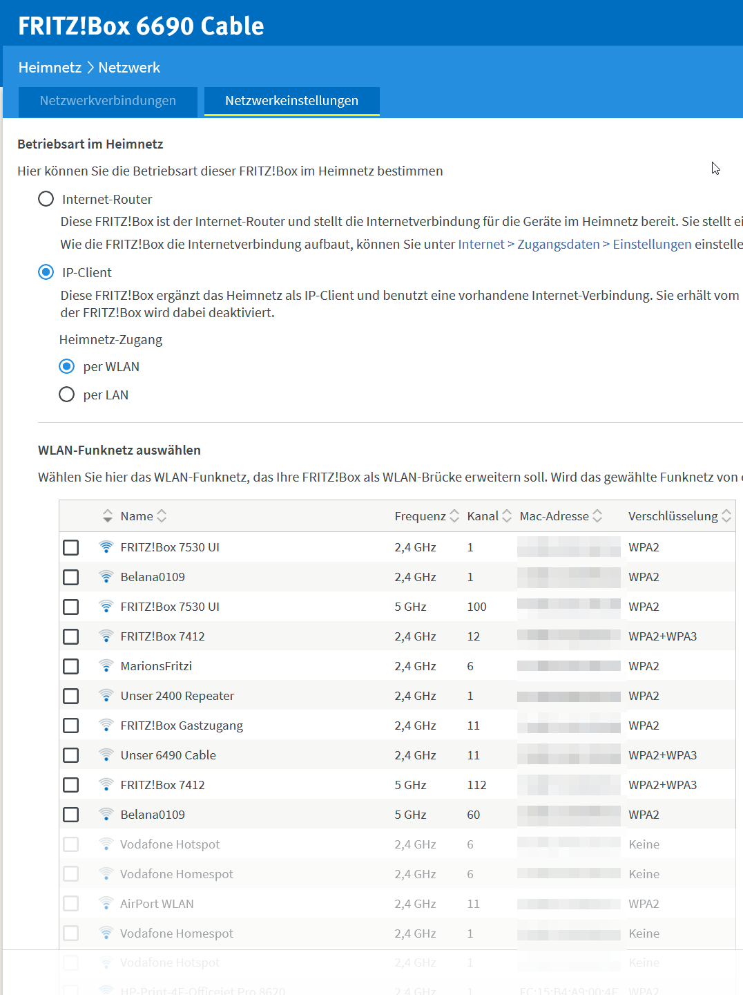 Das Problem ist nur, man kann in der Weboberfläche der Fritzbox (Heimnetz - Netzwerkeinstellungen) die VodafoneBox zum Verbinden per WLAN nicht auswählen (ausgegraut). Er hat eine o2 Edition FritzBox (Art.-Nr.: 2000 2658). Ich habe es an meiner freien 6690 Cable (gekauft bei Amazon) probiert und hatte genau dasselbe Problem. Ich hätte theoretisch meine Fritzbox nicht mit einer VodafoneBox verbinden können.