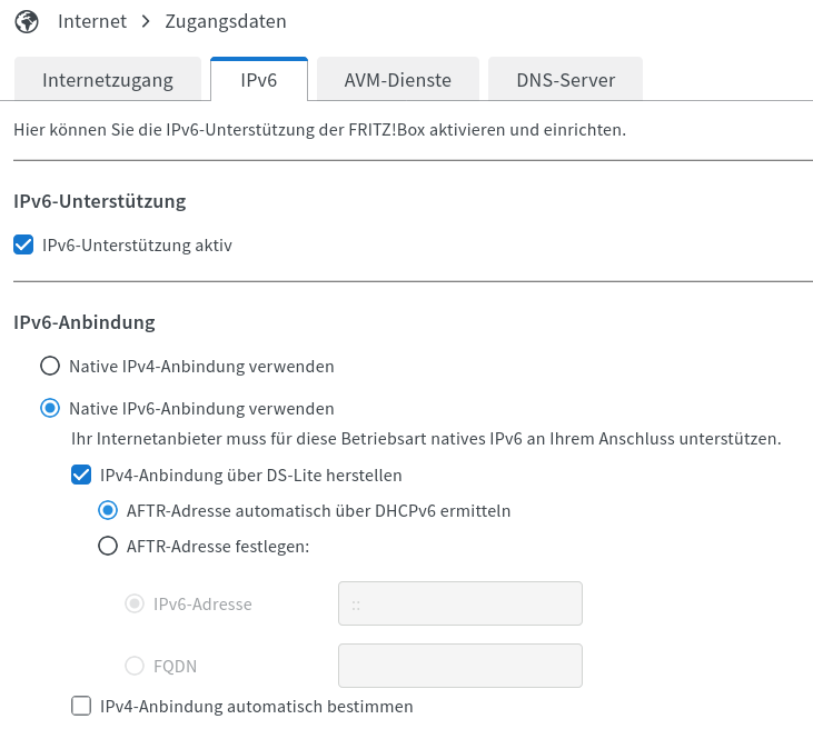 Wenn ich in der Fritzbox IPV6 aktiviere, funktioniert es leidlich. Ich habe am per Kabel verbundenen Desktop Internet und auch das WLAN funktioniert. Aber es läuft nicht alles: