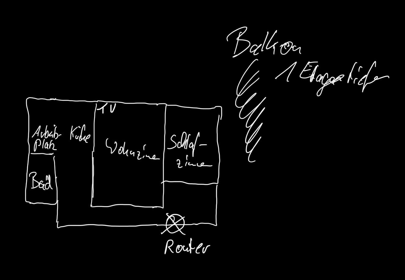 Im Anhang mal eine Skizze. Der Router ist vorne im Flur. Im Wohnzimmer hat meine Mum schon Probleme mit dem TV. In der Küche ist auch nicht viel wlan (war es aber noch nie). Der Balkon rechts ist eine Etage weiter unten.
