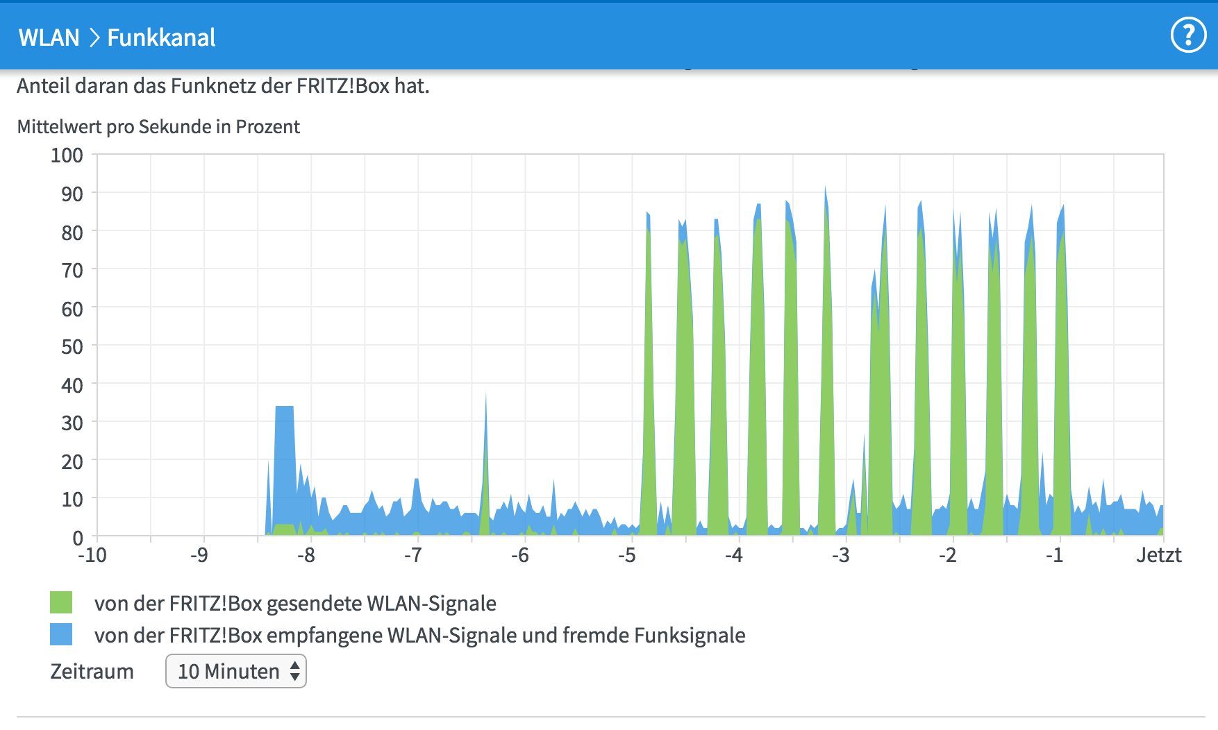 Mein Echo Dot ist mit dem 2.4 Ghz Wifi verbunden (das 5 Ghz sehe ich bei der Einrichtung gar nicht). Leider bricht zwischendurch immer mal wieder die Verbindung ab. Die Fritzbox zeigt dann das Verhalten hier auf der Grafik: