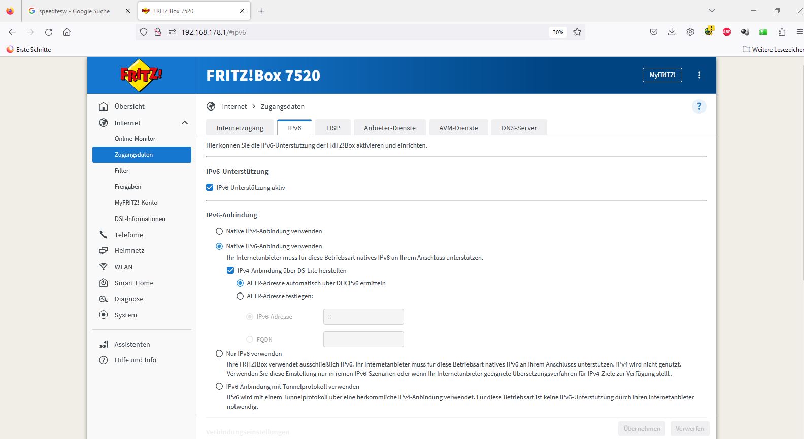 Ich bin mir jetzt nicht sicher ob die Konfiguration so richtig ist, die Box wurde von 1&1 für DS Lite konfiguriert.