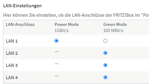 Hallo, woran liegt das das das bei meiner FritzBox die Lan-Anschlüsse 2-4 deaktivert sind mit einem strich - das bedeutet man kann sie nicht auf 1 GB umstellen, und wenn man die 100 MB Variante nutzen möchte bei den anschlüssen 2-4 bekommt man keine Verbindung zum Internet, nicht mal eine sehr schlechte...also kann ich im endeffekt nur Lan-Anschluss 1 benutzen. Wäre nett wenn mir jemand helfen kann.gekauft wurde sie aus dem freien handel, das bild der startseite ist ebenfalls unten angehängt