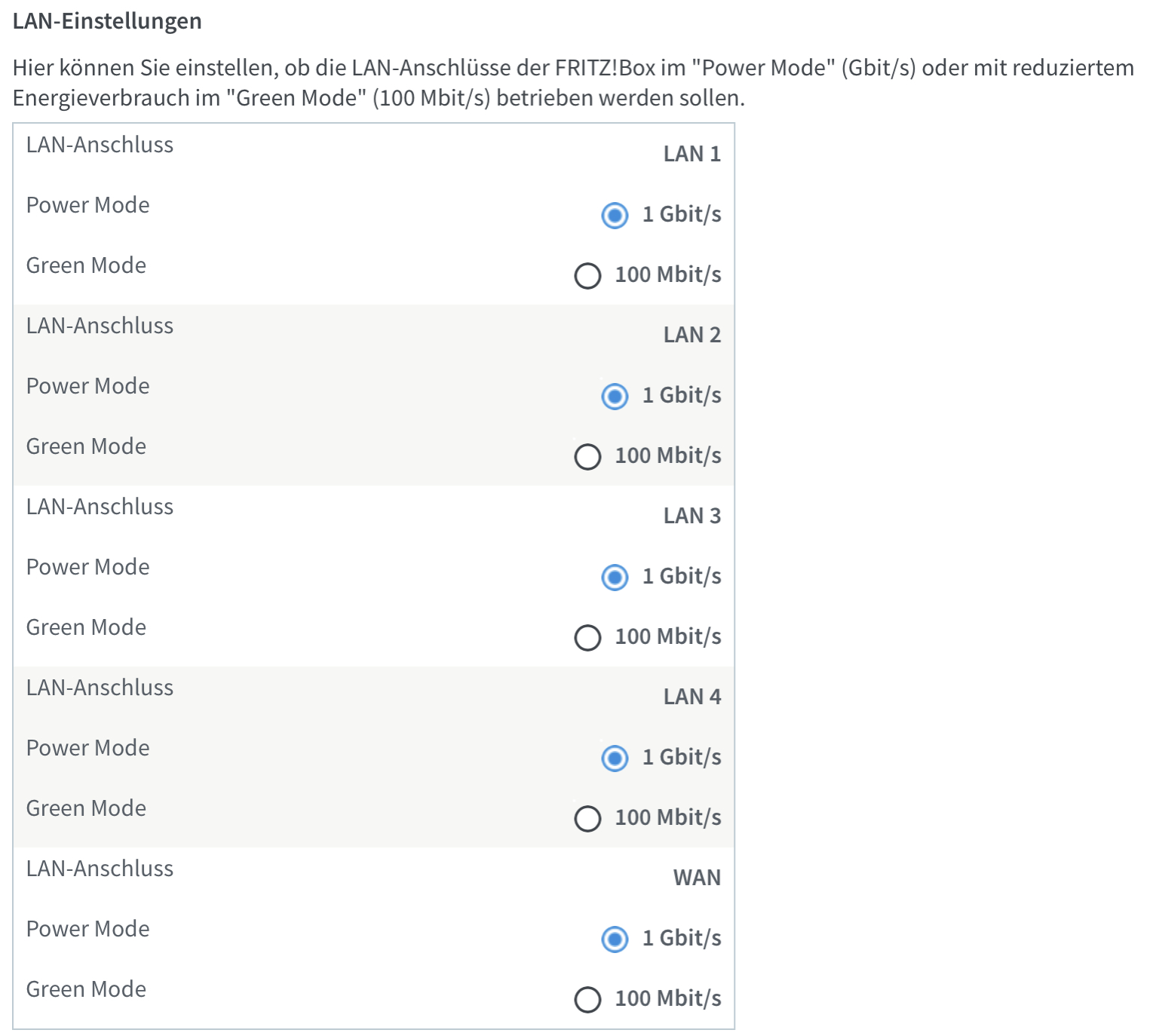 Ich habe den Power Mode an jedem Port eingestellt, mehrmals in den Green Mode hin und her gewechselt, auch versucht nur einen Port als Power Mode zu verwenden, die FRITZ!Box neu gestartet, entsprechende Einstellung in dem Adapter Eigenschaften des PCs ausprobiert. Ich habe die Geräte direkt mit der FRITZ!Box verbunden also hängt nichts dazwischen. Ich habe verschiedene Kabel ausprobiert.