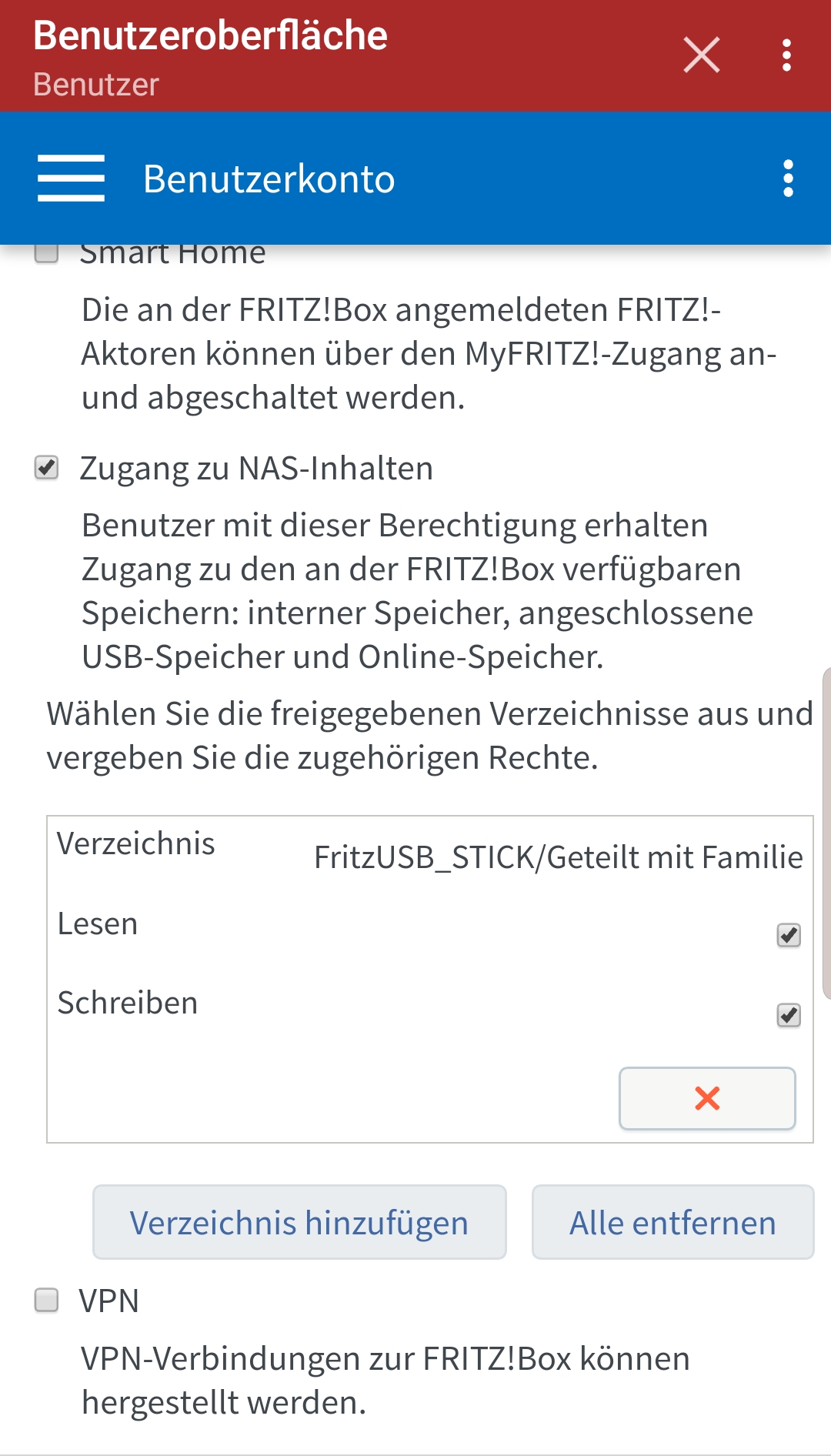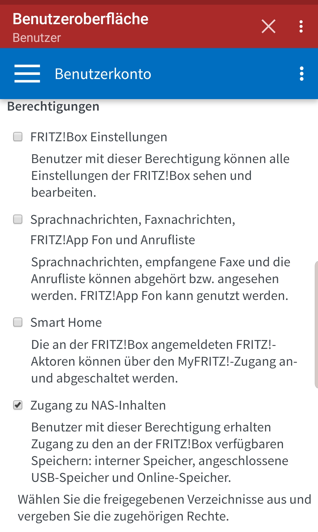 ich habe ein neuen Benutzer (mein Bruder) zu meiner Fritzbox7590 hinzugefügt , er soll zugriff auf mein Fritz.nas haben.