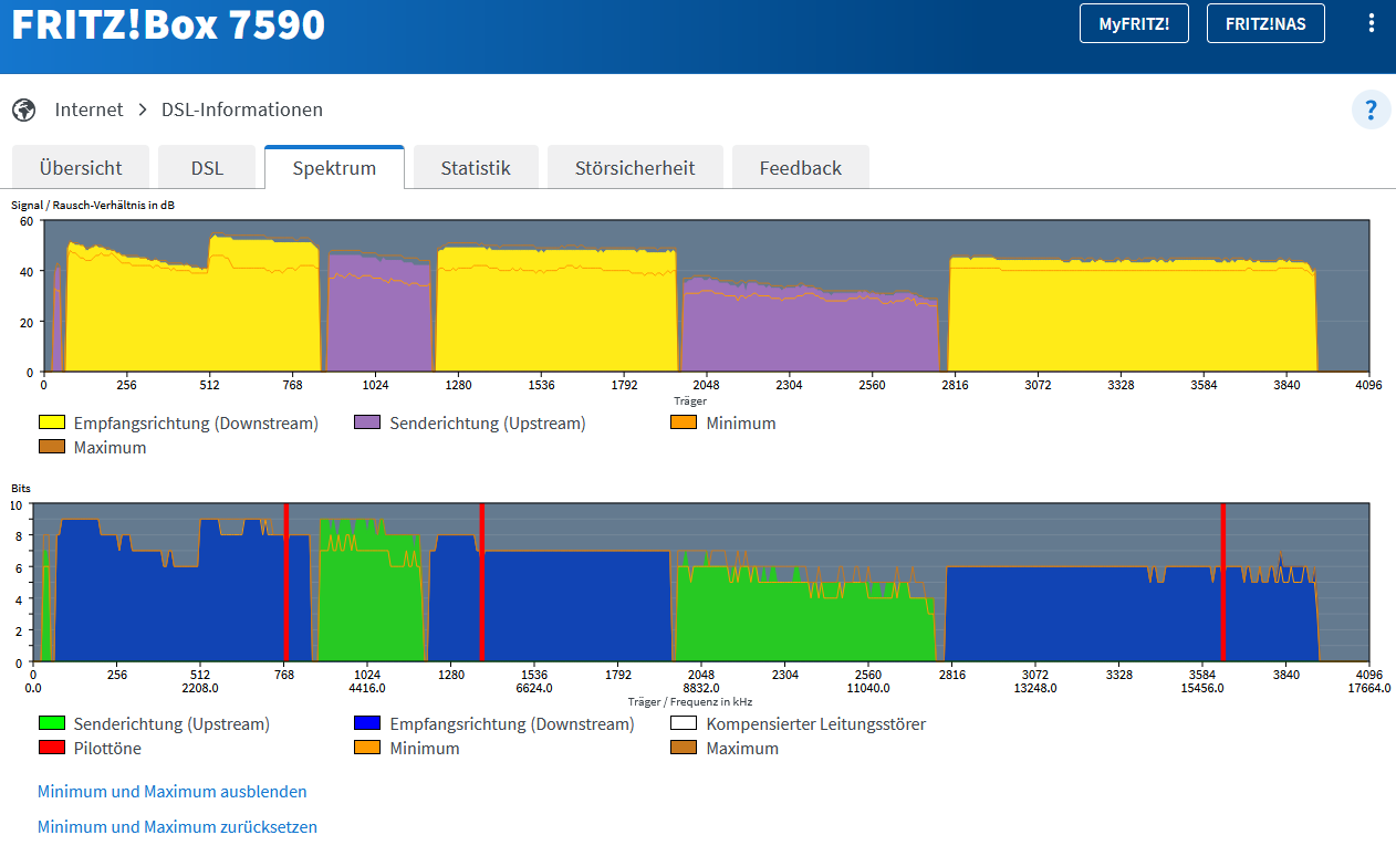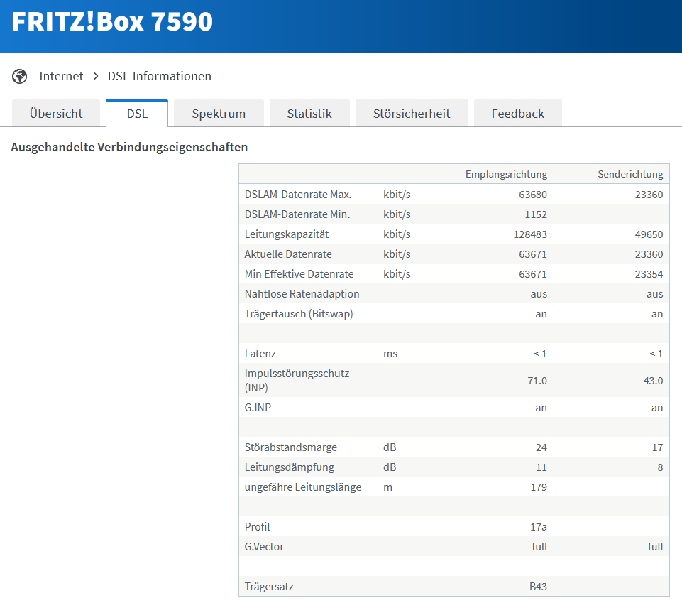 Das Spektrum ist immer noch nicht optimal, aber dafür sieht die Leitungskapazität schon gut aus für Vectoring 17a. Wie schon erwähnt wurde, muss sich das erst wieder einpendeln, dann sollte es sukzessive mehr werden.