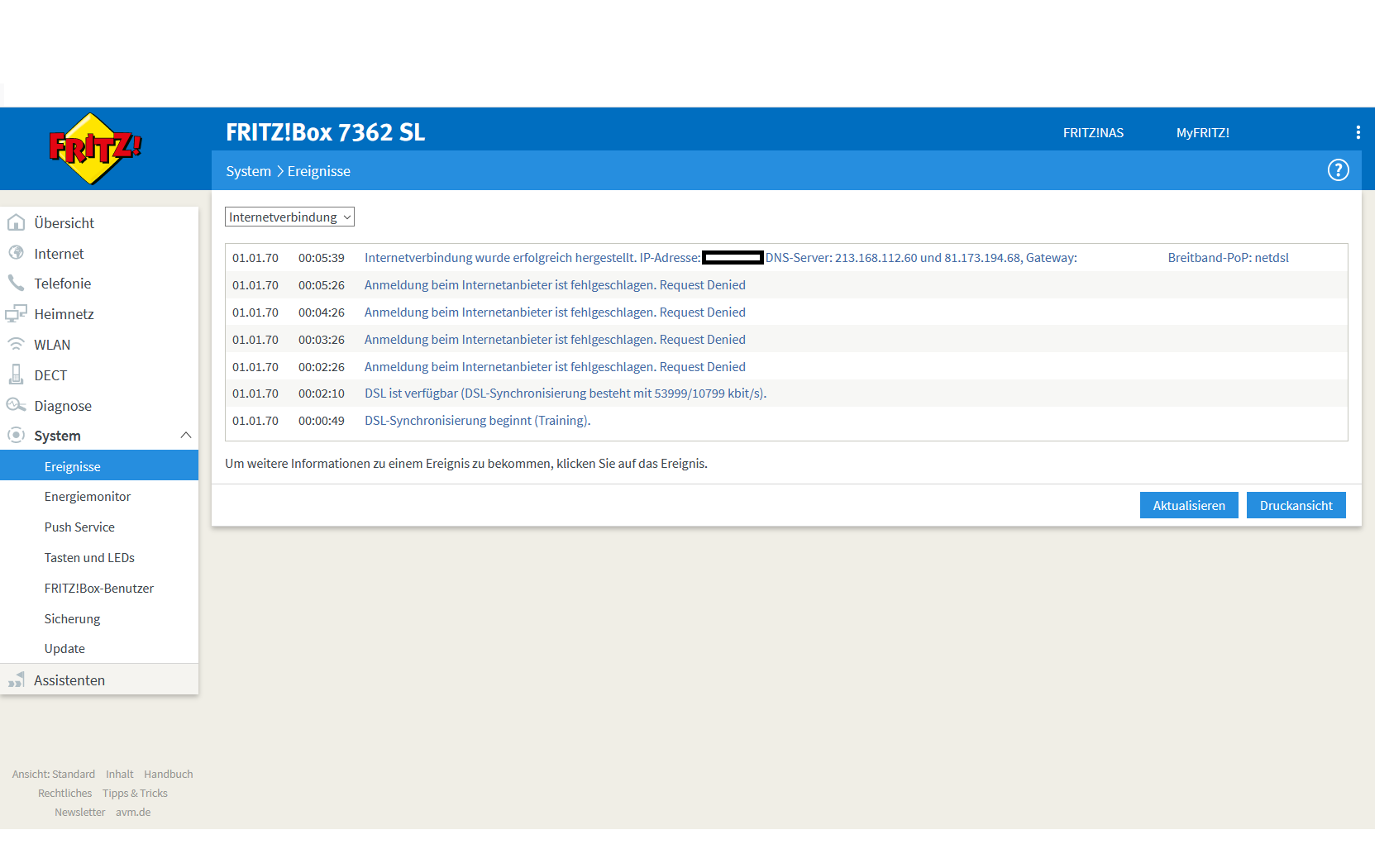 ich wende mich an euch, weil ich mit einer Fritzbox 7362 SL nicht mehr weiterkomme. Die Box ist aus einem Altvetrag von 1&1 und jetzt mit Netcolonge VDSL 50. Die Fb zeigt im Reiter Übersicht den richtigen Up- und Downstream an, DSL ist verbunden und die Power/DSL LED ist dauerhaft an. Weiterhin bezieht die Fb eine IPv4 Ip, (IPv6 nur über die Option IPv6 Tunnel).