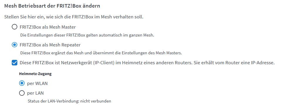 So sieht das bei AVM aus: AVM Mesh Repeater Hier ist das Meshzeichen zu sehen. Ich habe das IP-Client Häkchen mal entfernt und es nochmal per Connect-taste probiert, sieht aber dann auch so aus.