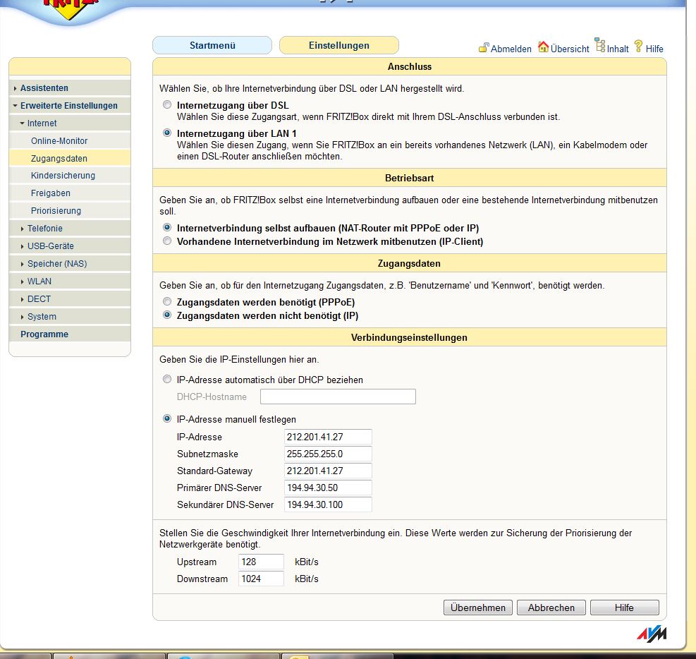 Ich möchte meine Fritzbox 7270 an meine Lan Dose im Wohnheimzimmer anschließen. Internetdaten wie IP und DNS sind vorgegeben.