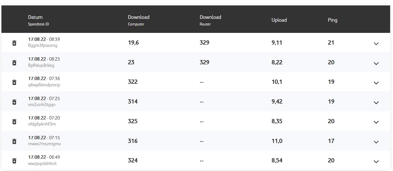 Sämtliche Speedtests (speedtest.net, Vodafone, Zak) melden dann nur noch ca. 5 - 7 MBit im Dowload und ca. 8 im Upload in der FB selbst ist bei Kabelinformationen alles i.O. d.h. dort wird nach wie vor 328 / 11 Mbit angezeigt.