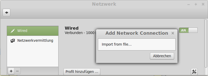 Das zweite Gerät ist ein Linux Mint-Laptop (Version 17.2). Wenn man bei diesem unter Netzwerkverbindungen ein weiteres Netzwerk hinzufügen möchte, kann man nur auswählen „Import from file...“ (siehe Foto).