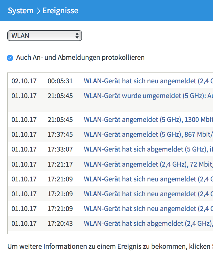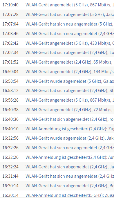 Die WLAN Verbindungen sind sehr instabil, die Geräte fliegen ständig raus und melden sich dann wieder an - die erneute Anmeldung schlägt dann manchmal fehl, angeblich weil falscher WLAN Schlüssel. (Hab mal zwei Screenshots aus dem Protokoll dazu angehängt) Die Abstände zwischen 2 Abbrüchen können teilweise nur wenige Sekunden kurz sein, dann ist das Netz vollkommen unbrauchbar, weil man andauernd rausfliegt. Manchmal ist die Box auch gnädiger und die Abbrüche treten nur alle paar Minuten/Stunden auf.