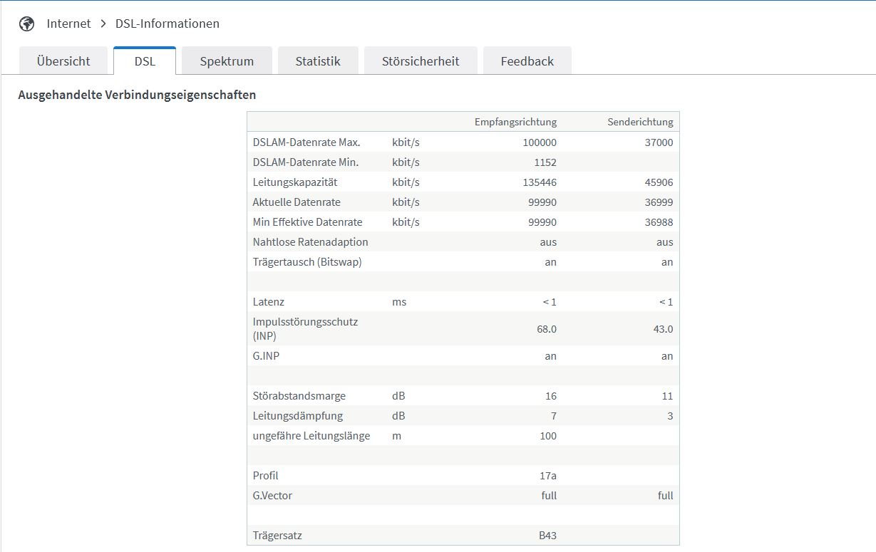 Der DSLM/MSAN steht aber auch nur gut 30 Meter von meinem Haus entfernt. Die Fritzbox zeigt mir war eine Leitungslänge von 100 Meter an, was eigentlich nicht sein kann, aber selbst 100 Meter dürften ja keine Probleme darstellen.
