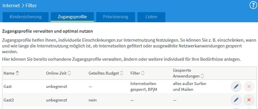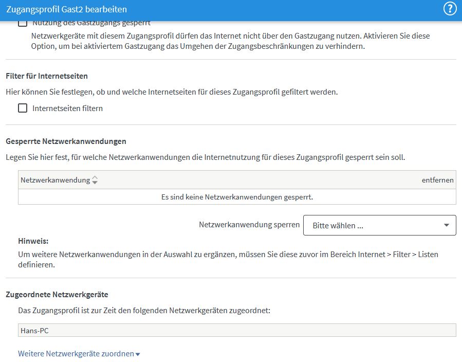 Das finde ich persönlich äußerst bescheiden und werde das mal an AVM als Verbesserungsvorschlag übermitteln, hier nicht auch wie fürs interne Netz möglich, mehrere Zugangsprofile auch fürs Gastnetz definieren zu können weil so werden Erwachsene und eben Kinder unter dem Begriff Besuch/Gast in einen Topf geworfen.