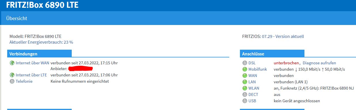 Im Einsatz ist eine Fritz Box 6890 LTE mit LTE Zugang Flat (300Mbit).
