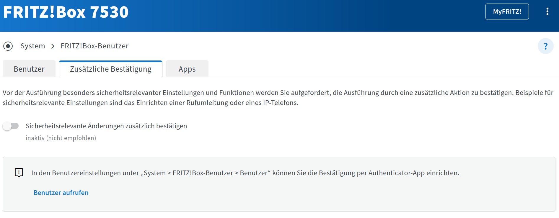 Da an die FB kein Telefon angeschlossen ist und sich die FB außerhalb der Reichweite befindet (50 m entfernt im Versorgungsaum) war meine Absicht wie von AVM vorgeschlagen eine Authenticator-App für mich als Benutzer einzurichten.