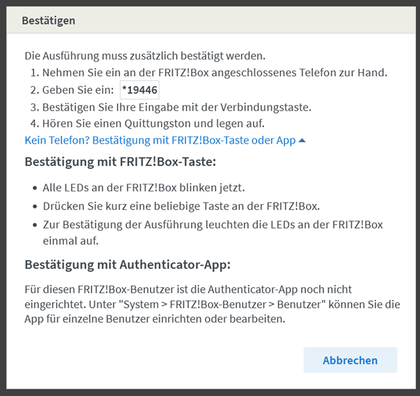 "Die Ausführung muss zusätzlich bestätigt werden. Nehmen Sie ein an der FRITZ!Box angeschlossenes Telefon zur Hand. Geben Sie ein:*14710. Bestätigen Sie Ihre Eingabe mit der Verbindungstaste. Hören Sie einen Quittungston und legen auf. Kein Telefon? Bestätigung mit FRITZ!Box-Taste oder App".
