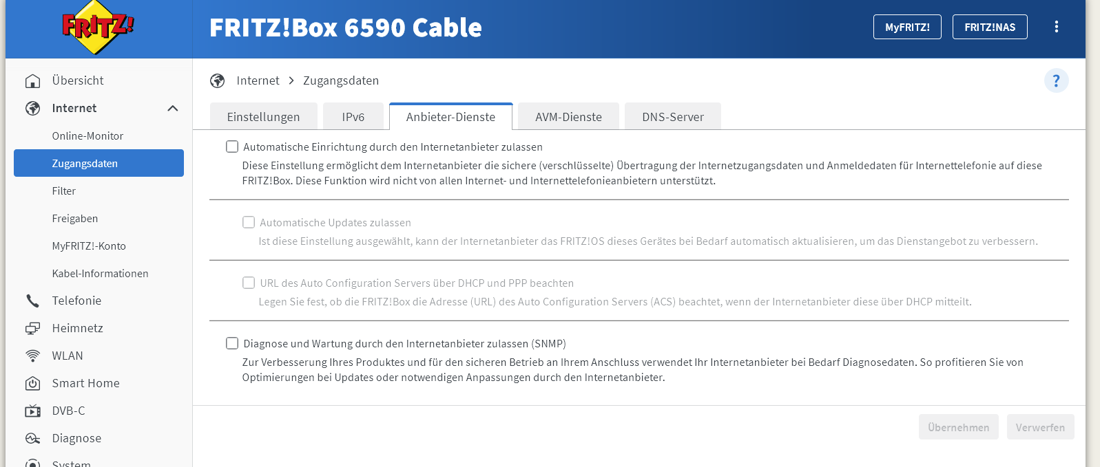 ich habe eine eigene Cable Fritzbox. Nach einem Werksreset habe ich das Problem, dass unter Diagnose -> Sicherheit beim Punkt „Einrichtung von USP-Controllern durch den Dienstanbieter“ auf erlauben steht. Hat jemand eine Idee wie ich die Option wieder aus „deaktivieren“ kann? Im Reiter „Anbieter-Dienste“ unter Zugangsdaten habe ich nur die Möglichkeit SNMP zu deaktivieren.