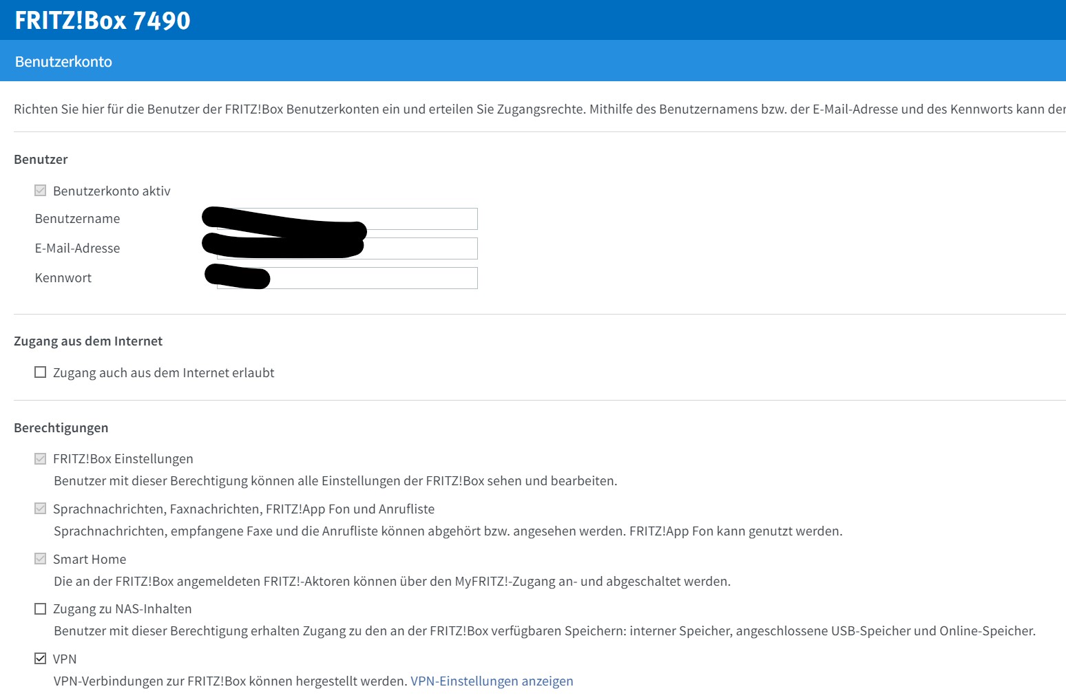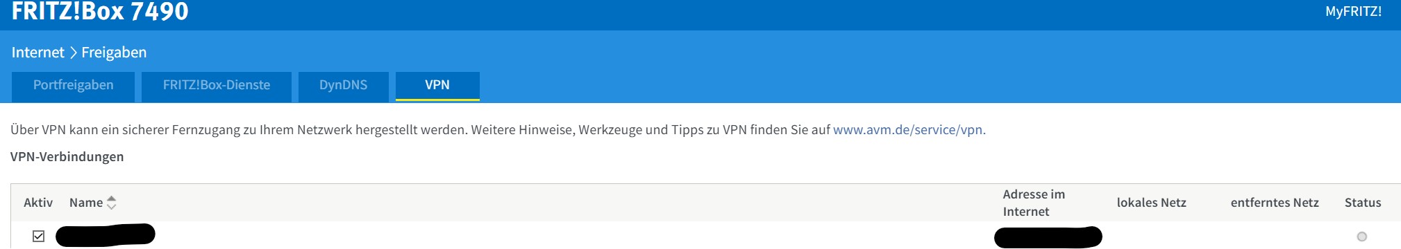 gemäß dieser Anleitung habe ich an meiner Fritz Box 7490 einen VPN eingerichtet: