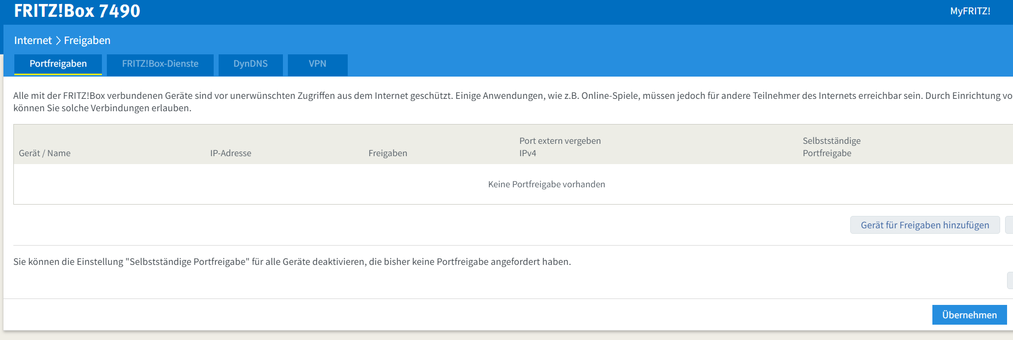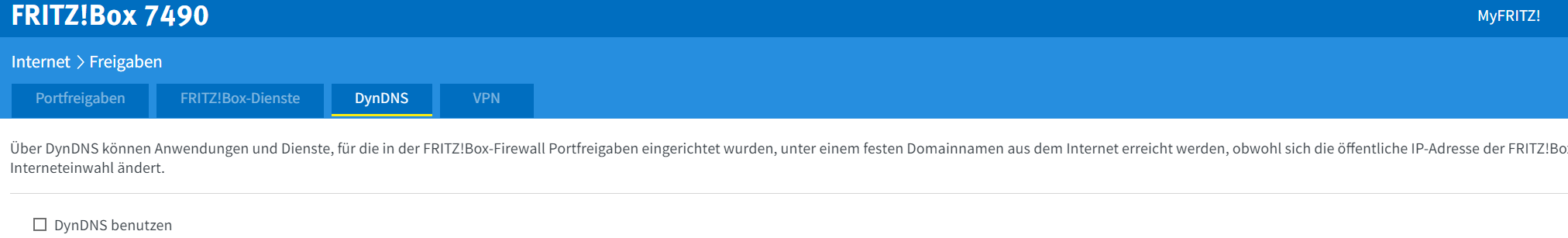 DynDNS wird über MyFritz! realisiert. Portfreigabe ist nicht aktiv, da es m.E. sicherer ist per VPN einen Zugriff auf ein Netzwerk zu realisieren.