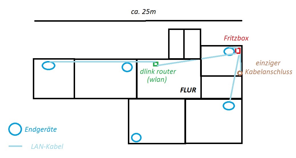 Die Fritzbox hängt über Kabelanschluss in ganz in der Ecke der Wohnung. Die letzten internetfähigen Geräte sind ganz am anderen Ende der Wohnung, wo das WLAN-Signal nicht mehr ankommt. Es liegen mehrere Wände dazwischen.
