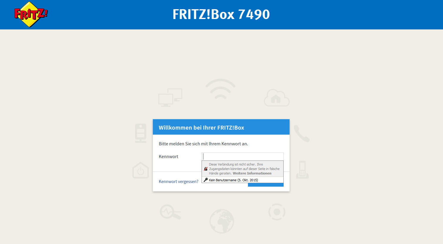 Die Meldung kommt, weil das ein Login-Formular auf einer nicht verschlüsselten Seite ist. Die Fritz-Box spricht auch HTTPS, allerdings mit einem selbst signierten Zertifikat. Das ist aber immer noch besser als der unverschlüsselte Zugang. Daher die Adresse auf HTTPS umstellen, beim Aufruf die Sicherheitswarnung einmal abnicken und eine dauerhafte Ausnahme einrichten, und weg ist die Meldung.