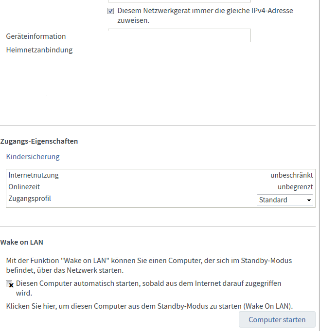 Bei meiner 7490 kann ich bei allen Rechnern im Heimnetz "Diesem Netzwerkgerät immer die gleiche IPv4-Adresse zuweisen" Haken rein und etwas tiefer im Menü den Haken setzen fürs WakeonLan und kann über die Fritzbox auch den Rechner aufwecken, ich mache es mit dem Smartfone und der App "Fritz!Box", wähle mich in die Box ein und starte den Rechner, Nas usw.., ob Du diese Einstellungen auch hast weiss ich nicht, kenne die Box ja nicht.