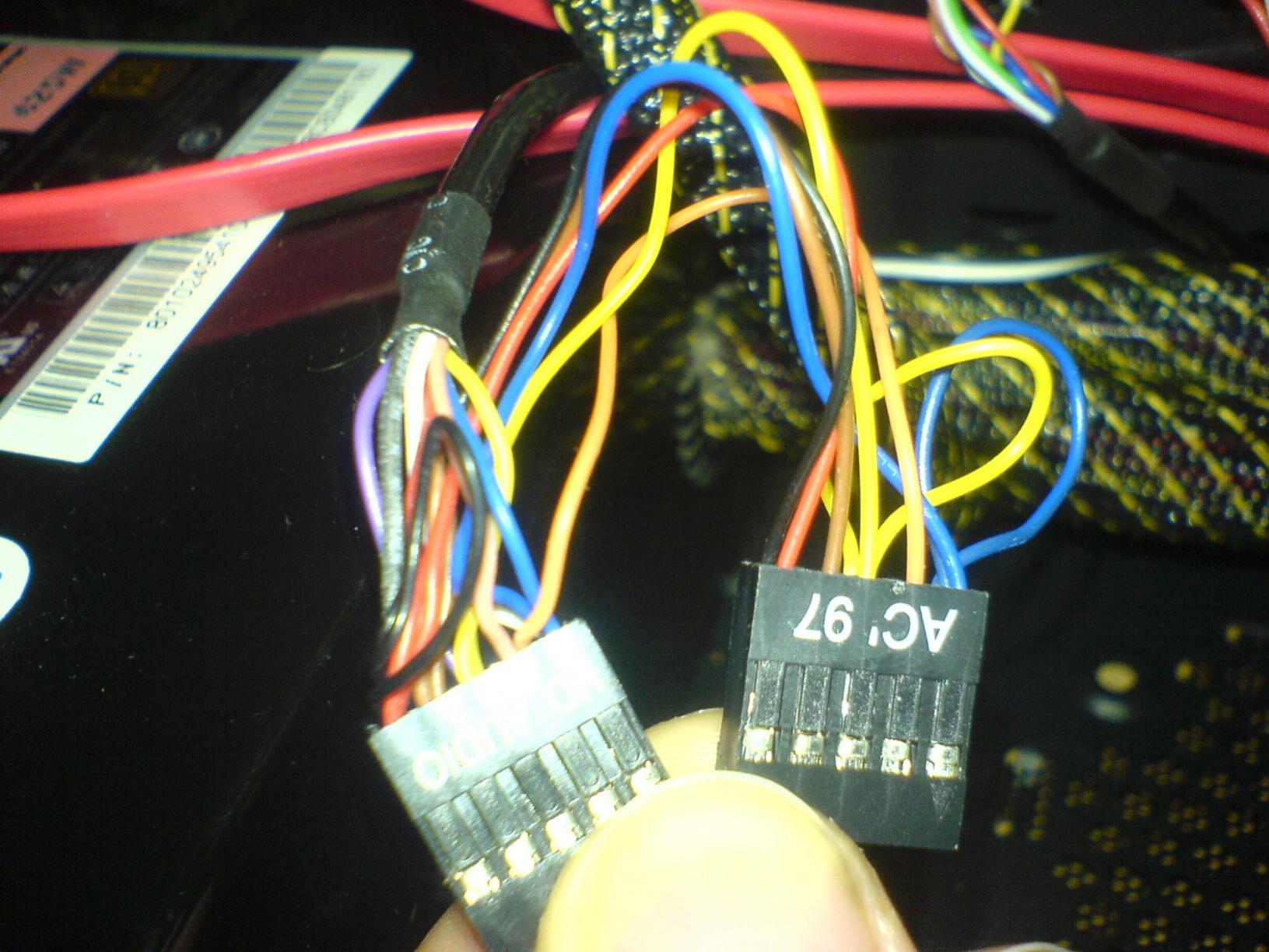 Um genau zu sein ist es kein Flachkabel. Und es sind auch nicht nur 4 Kabel, sondern 7 am HD und 5 am AC97. Ich hab die Stecker mal fotografiert. Sind ganz normale 10Pin Stecker fürs Board, mit verschlossenem Pin 7 zur Kodierung.