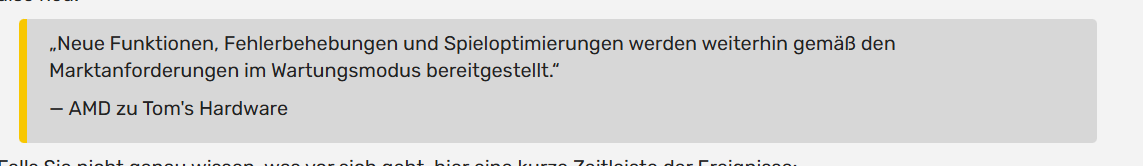 Um das klarzustellen: AMD ist hier nicht zurückgerudert. Nicht einen Millimeter. Sie haben lediglich ein lame ass excuse herausgegeben, dass sie Updates "as required by market needs" veröffentlichen werden. RDNA1+2 befinden sich weiterhin im Legacy-Status.