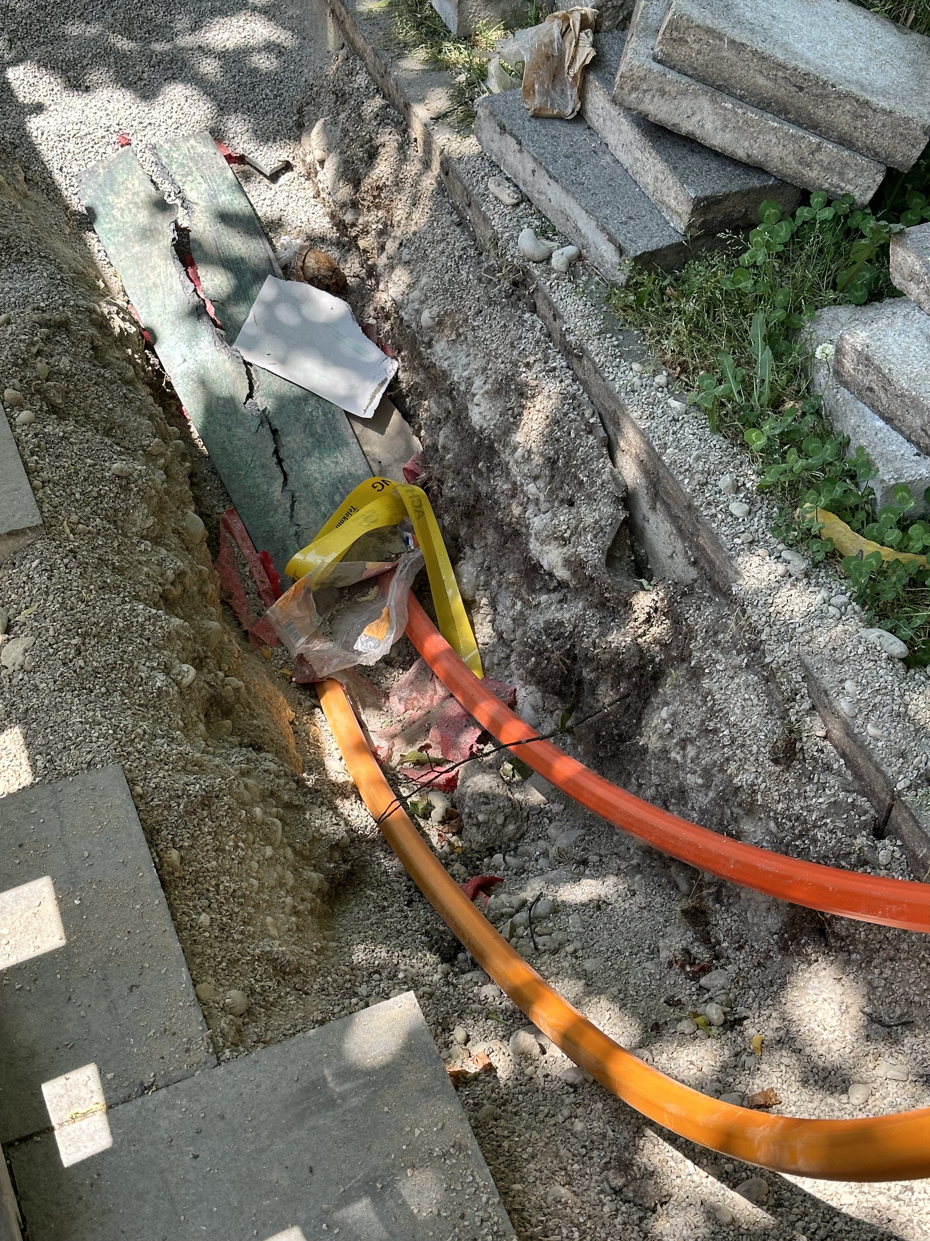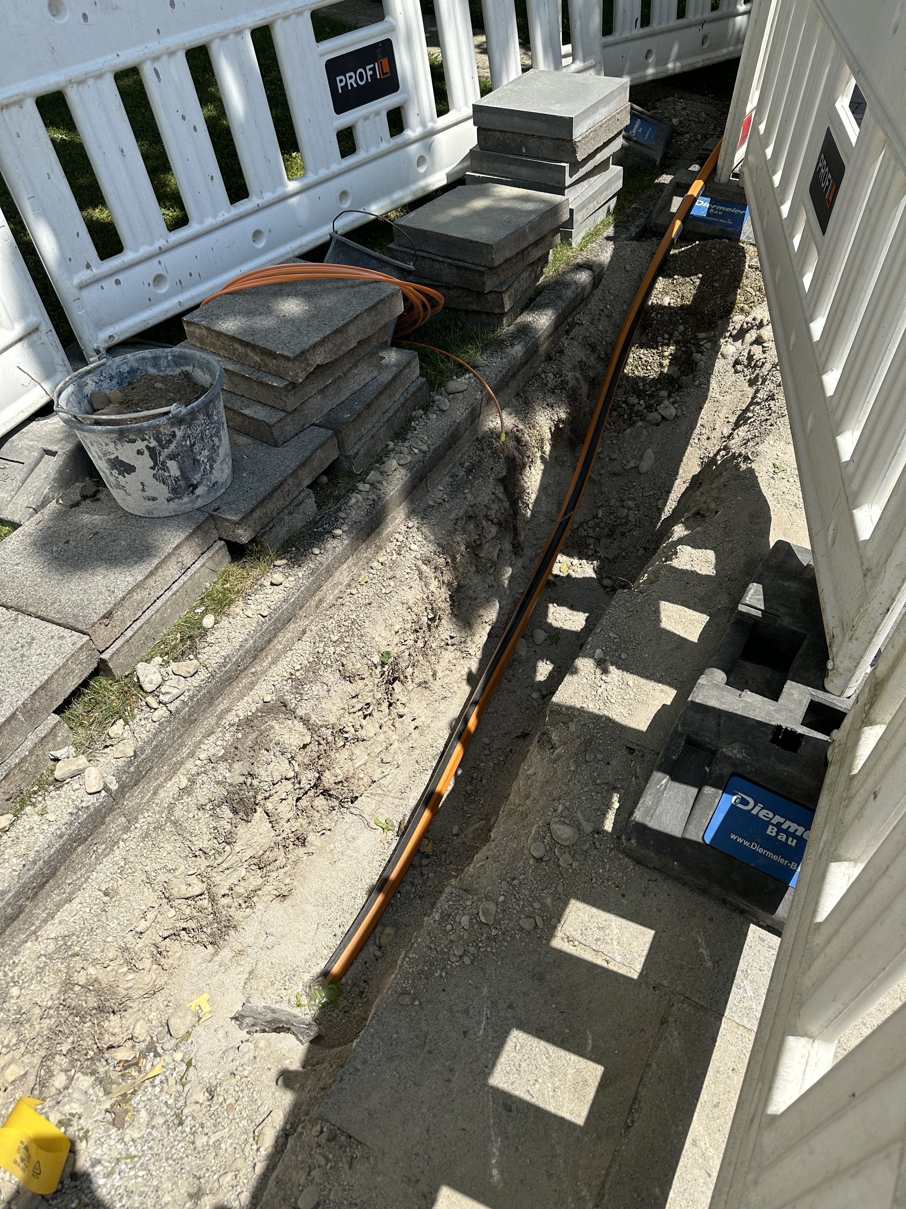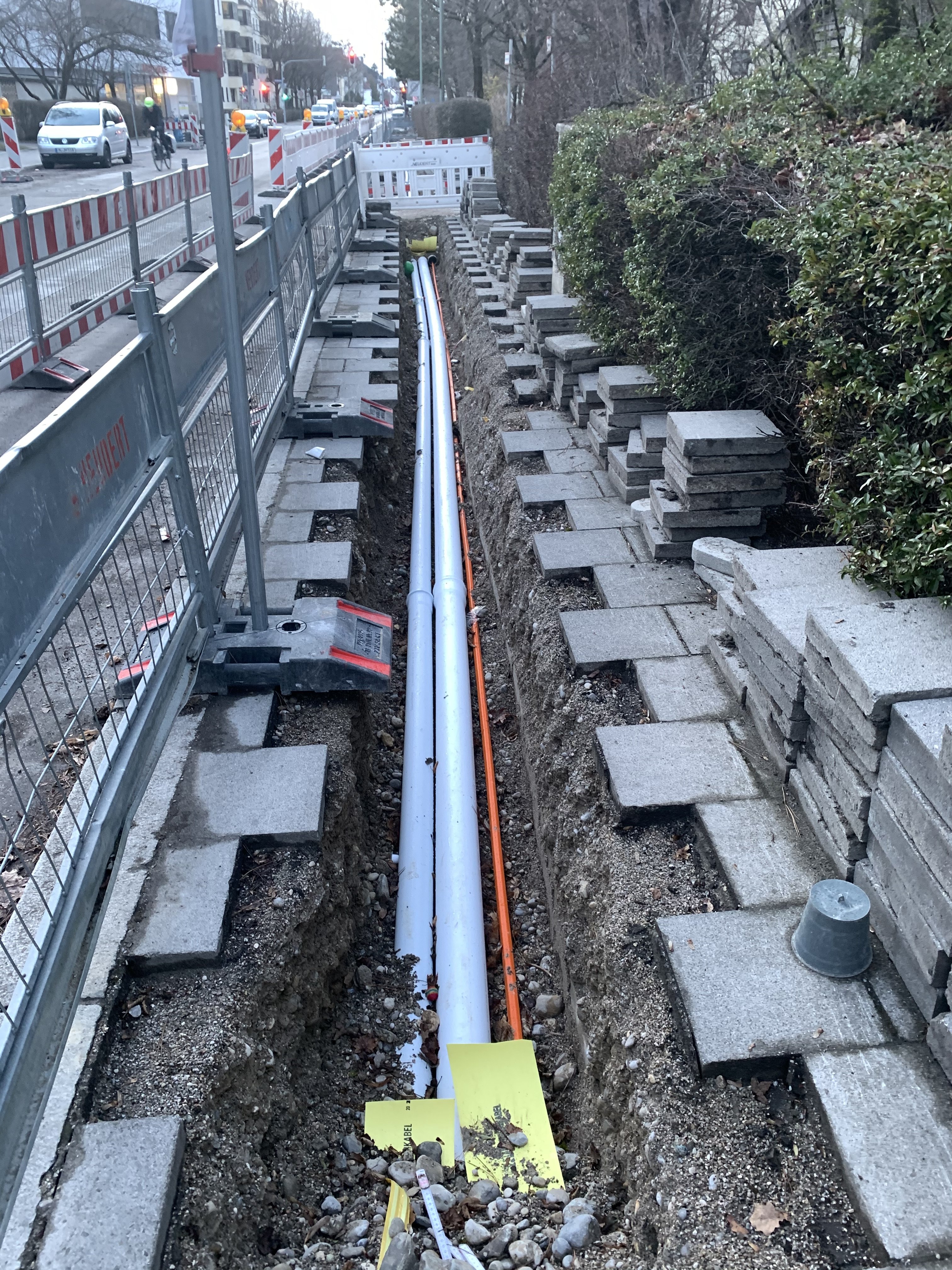 Interessant ist, dass sie gar keine bestehende/weitere Infrastruktur wie Leerrohre oder so nutzen / bauen. Es werden einfach nur speedpipes in ~40cm tiefe unter die Gehwege gelegt. Aber gut, viel Platz ist da auch nicht mit: Telekom FTTC, Vodafone, KMS, Colt, M-Net, BT.