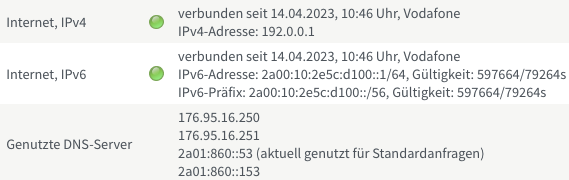 Hallo, ich habe am 12.04.23 bei Vodafone angerufen und einmal Dual-Stack IPv6/v4 einrichten lassen. Die änderung wurde am 13.04.23 ausgeführt. Nur finde ich meine IPv4 sehr merkartig. Es ist in der FritzBox (4060) immer eine 192.0.0.1 und von außen ändert Sie sich immer. Erreichbar bin ich per IPv4 nicht mehr.