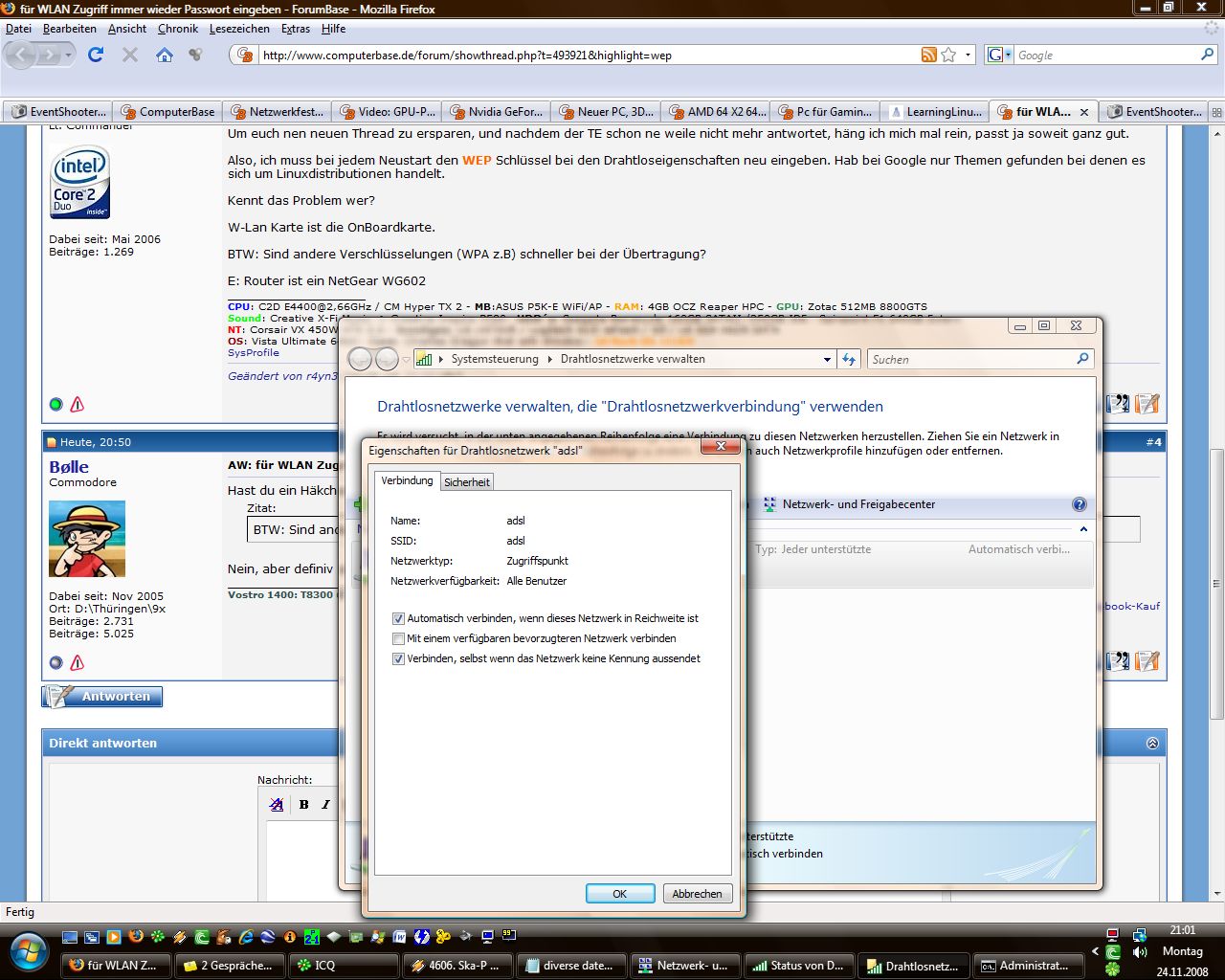 ich habe ein kleines Problem. Wir haben ein WLAN DSL Paket bekommen.... schön erstmal. Leider muss ich das Passwort immer neu eingeben um auf das Internet zuzugreifen. Also : nach jedem Neustart muss ich mich neu anmelden und kann dann das Internet ohne Probleme nutzen. Gibt es da irgendwo ne Möglich keit das Passwort dauerhaft für den PC zu speichern?