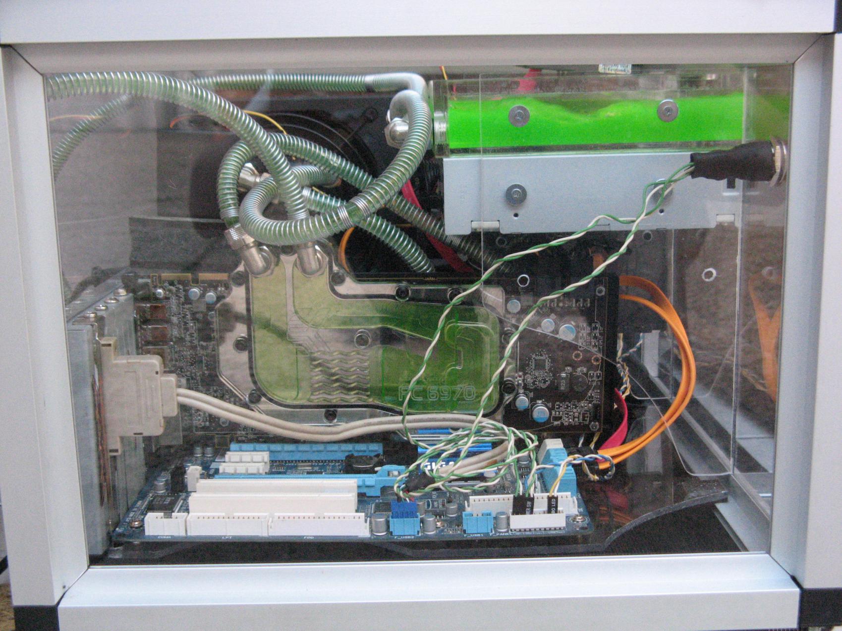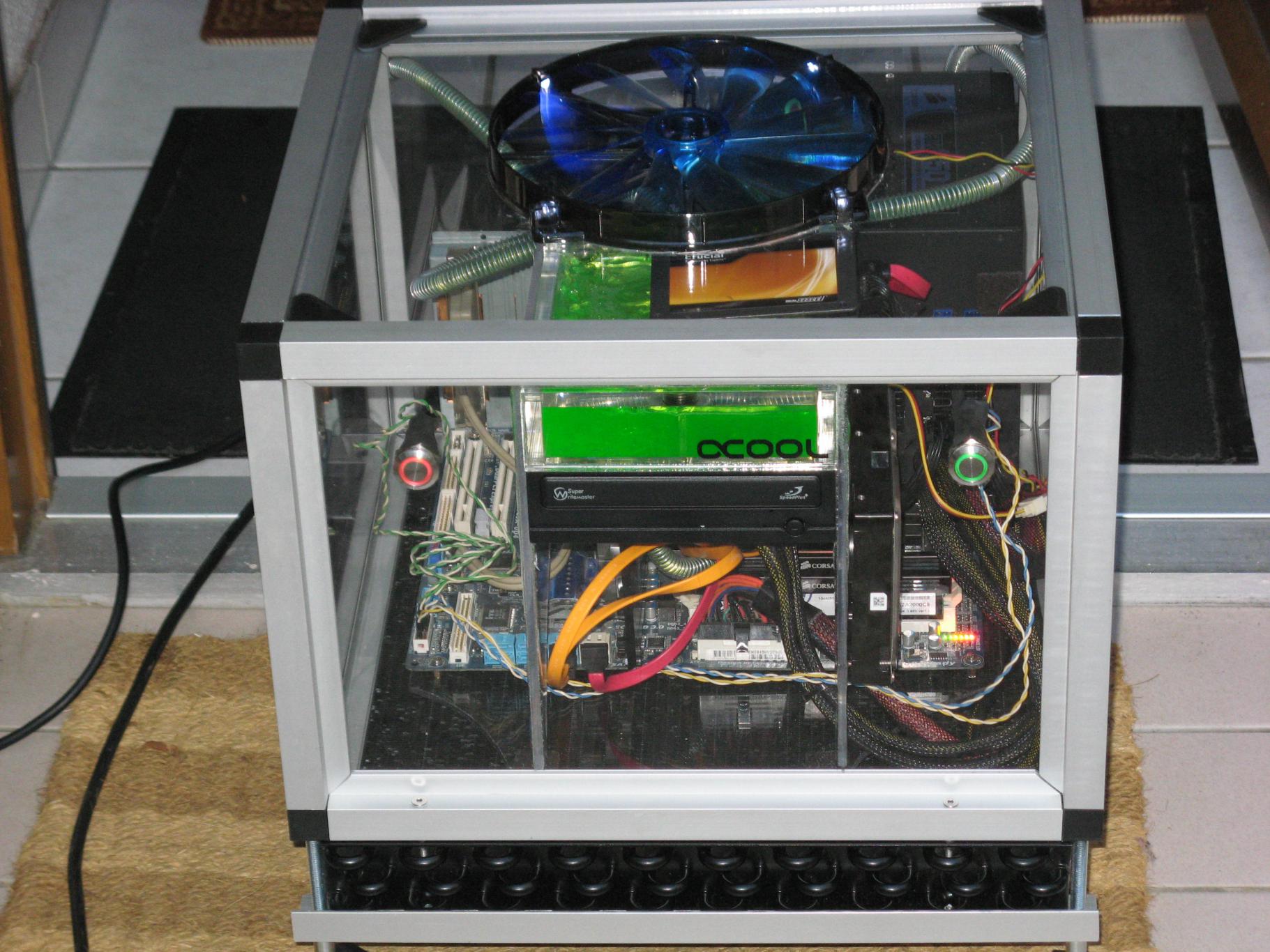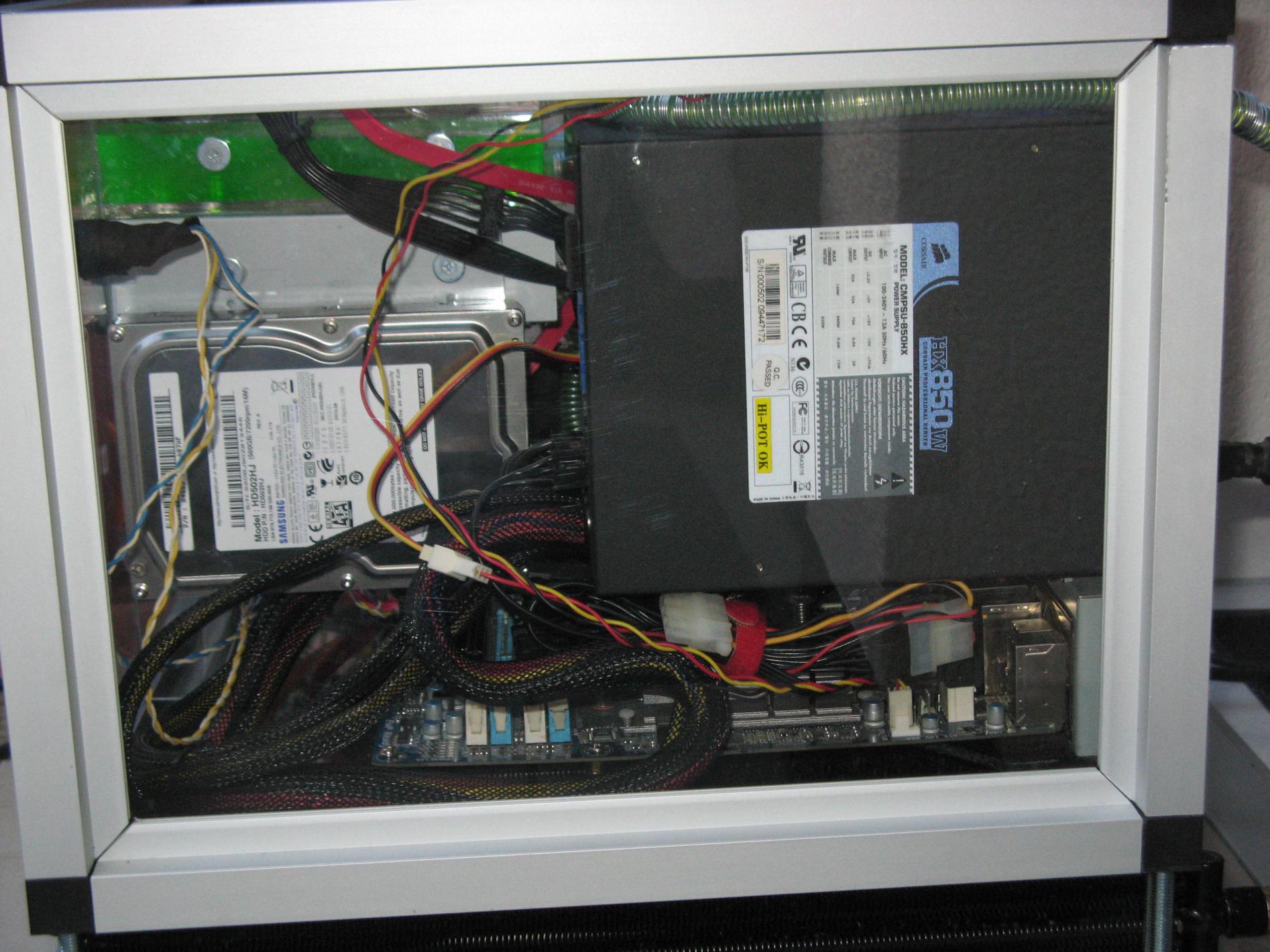 Das Case ist noch nicht ganz fertig, Probleme gibt es noch bei den HDD Halterungen und bei der Wahl des richtigen Lüfters, bisher wurde flogende Hardware verbaut: