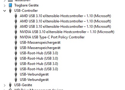 Als Vorüberlegung für das Anschließen externen Daten-HDDs versuche ich mir einen Überblick über meine USB-Anschlüsse zu verschaffen. Dabei ist mir aufgefallen, dass ich die Einträge im Geräte-Manager (Win 10) unter USB-Controller nicht richtig verstehe bzw. nicht zuordnen kann. Gleichzeitig tauchte bei mir die Frage auf, ob meine USB-3.2-Gen-2-Anschlüsse evtl. gar nicht richtig konfiguriert bzw. ob evtl. gar nicht die richtigen Treiber dafür vorhanden sind? Zumindest steht da nichts von USB 3.2. Siehe angehängtes Bild. Oder erliege ich da einer Verwirrung bezüglich der nicht einheitlichen Benennung von USB-Generationen?