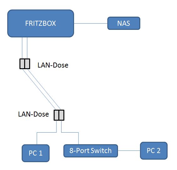 Dort wird am einen Port ein PC angeschlossen und am anderen Port ein 8-Port Switch für einen zweiten PC und weitere LAN-fähige Geräte.