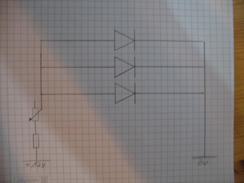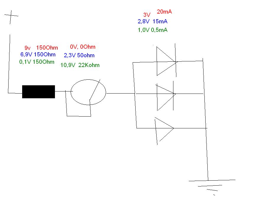 Also ich hatte vor, vor das Potentiometer einen Widerstand (R = U / (Anzahl_LEDs * I) = 9V / (3 * 0,02A) = 150Ohm) zu bauen, damit die LEDs (wenn das Potentiometer einen Widerstand von 0Ohm hat) nicht beschädigt werden. Das Potentiometer sollte in diesem Fall einen maximalen Widerstand von mindestens 50Ohm bieten, da ab diesem Widerstand (meinen Berechnungen zu folge) keine Spannung mehr anliegt. Hinter dem Potentiometer sollen die LEDs parallel Geschaltet werden.