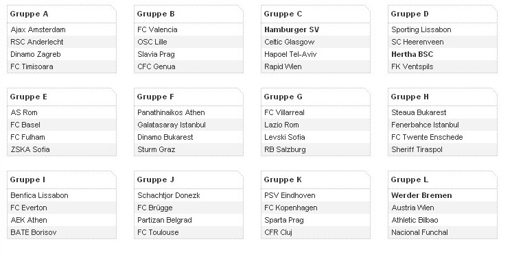 der hsv wird sich gegen celtic schwer tun, denk ich, und werder evtl gegen bilbao. aber is alles machbar für die beiden. hertha wirds aber schwer haben mit der derzeitigen mannschaft, vor allem gegen sporting und vllt auch gegen herrenveen