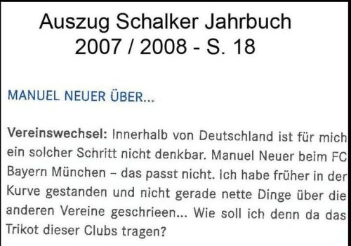 Mal ein Blick in den Pott würde auch nicht schaden, die ganzen Spielerwechsel zwischen Dortmund und Schalke... das war Bambule! Und nach ein paar Wochen pfeifen und plakatieren auch schnell wieder vergessen. Im Übrigen sehr bemerkenswert, wie abgezockt und cool Neuer damit umgeht. Traumhaft! Professionell ohne Ende, der wird nicht nur Bayern viel Spaß machen, sondern uns allen bei EM und WM.