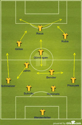 Und zwar bin ich irgendwie auf ein 433 als Aufstellung gekommen. Die Abwehr so wie immer. Die erste dreierreihe dann eventuell mit Sahin, Bender und Gündogan. Der Angriff dann mit Götze, Kuba und Reus.
