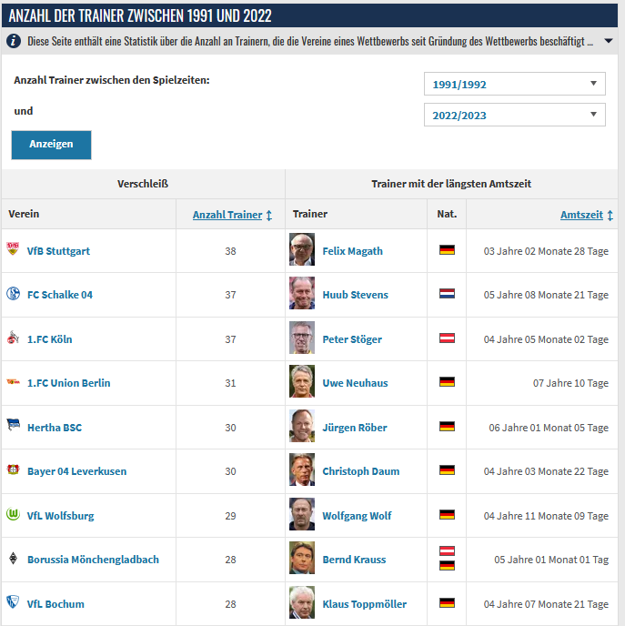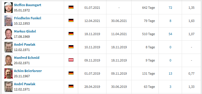 Bei Köln kommen da in dem Zeitraum um die 11 Trainerwechsel zusammen die nur kurz Interimstrainer oder solche statistischen Späße waren.