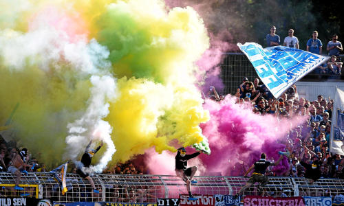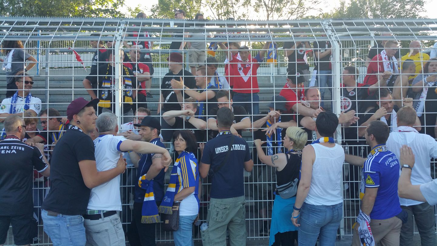Und jetzt alle zusammenreißen. Bist du gerade im Ernst-Abbe-Sportfeld? Gibt wieder die gleiche Choereo in der Kurve von Jena.