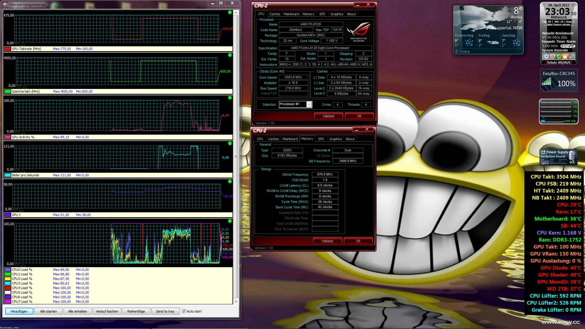 da gibts nicht viel drüber zu berichten. das ist wohl das, was man bei amd aktuell als highend bezeichnen kann. fx-8150, asus crosshair V formula, gskill ripjawZ 2133 mhz, kingston ssd 128 gb und ne fette radeon x300 se