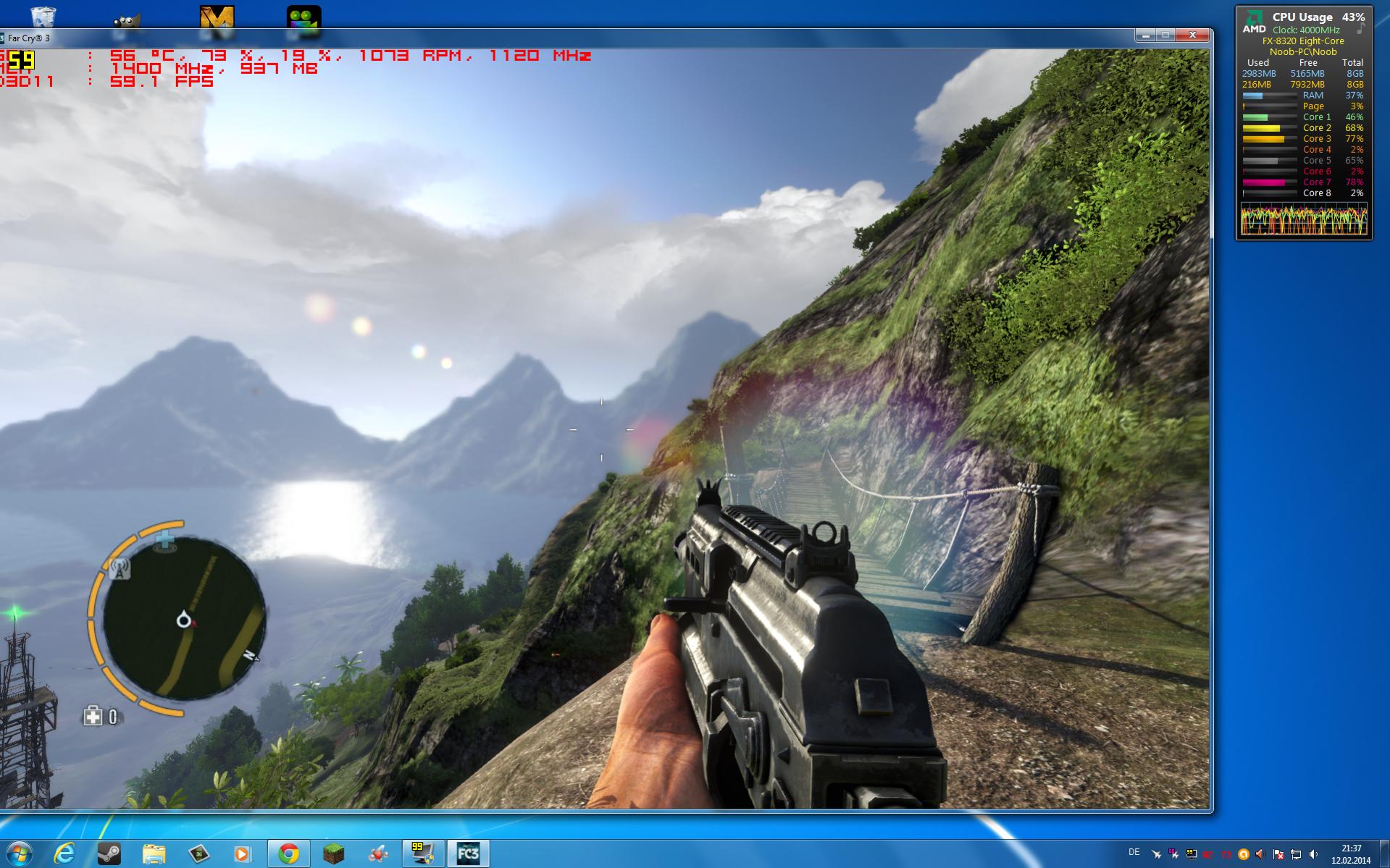 Ich besitze Far Cry 3 schon seit geraumer zeit und ich konnte das Spiel bis jetzt noch NIE richtig genießen weil das Spiel meinen PC einfach tötet ! Far Cry 3 ist das einzige Spiel das beispielsweise meine Grafikkarte (Siehe Signatur) auf 71 Grad bringt. Das hat noch kein anderes Spiel geschafft. Auch meine CPU wird beim zocken 60 grad heiß und die Auslastung ist hoch (Bis zu 65%). Das alles ist ja kein Problem immerhin sind die Temperaturen definitiv noch im rahmen. Aber 1 Problem ist mir doch vorhin aufgefallen und ich konnte es nicht fassen ! Alle Kerne werden belastet bis auf Kern 7 ! Der hängt bei 0% rum. Alle anderen Kerne werden ordentlich ausgequetscht dank Far Cry 3. Das Spiel braucht mehr Leistung als Furmark und Prime95 hab ich das Gefühl ! Aber warum stürzt bei mir ein Kern ab auch bei Prime95 ist das mal passiert und das bei 4GHz ohne Übertaktung. Warum passiert sowas ? Was kann ich dagegen machen ? Das ist ja der Supergau wenn beim zocken ein CPU Kern abstürzt obwohl er nicht übertaktet oder sonst was ist !