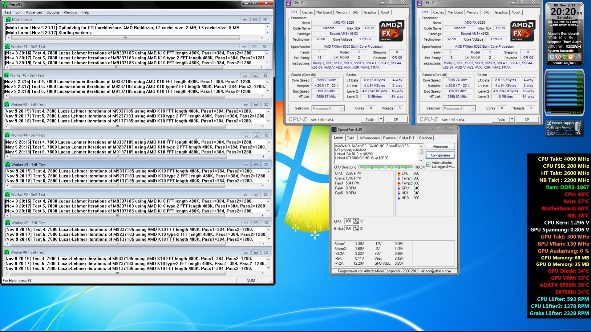 Also wurde dieses gegen ein System Power 7 500Watt und der Kühler gegen einen Macho getauscht. Nach dem zusammenbau erneuerter Test mit Prime. Ich muss sagen der Macho ist echt der wahnsinn aber sogar mit dem riesen Teil kratzt der FX gut in Prime noch immer an den 50-51°C. Von den Temp. Werten wäre es jetzt halbwegs in ordnung jedoch sehe ich alle 1-2Sekunden ein runtertakten sprich 3,1 Ghz und dann für Sekunden 1,4Ghz anschließend wieder 3,1Ghz das geht ständig so weiter.